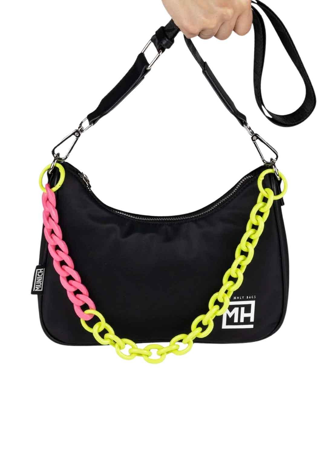 Bolsa Munich. Modelo Baguette. Cor preto. Fecho com zíper. Logo carimbado. Tecido de náilon. Alça de ombro ajustável para crossbody. Corrente colorida neon.