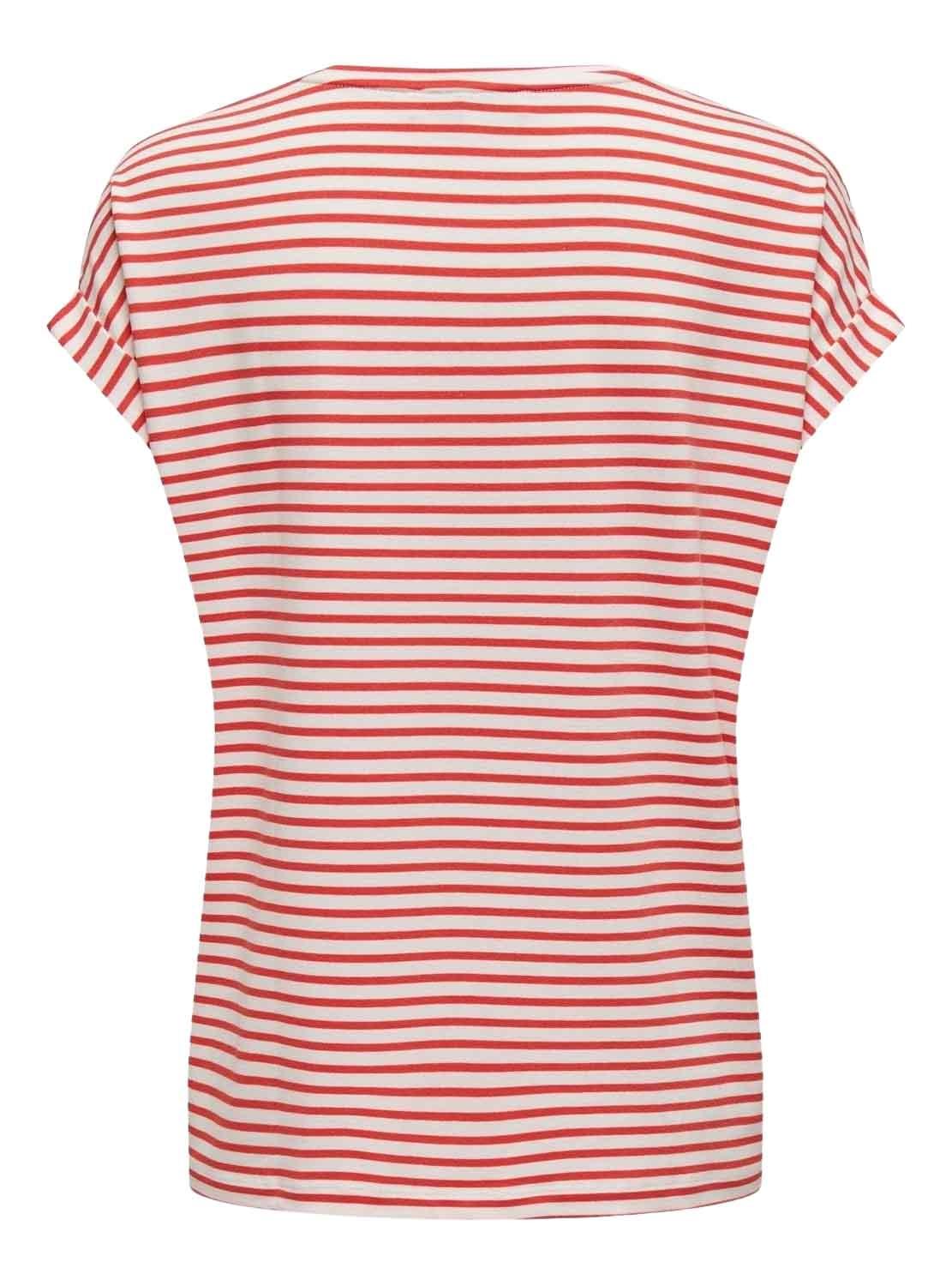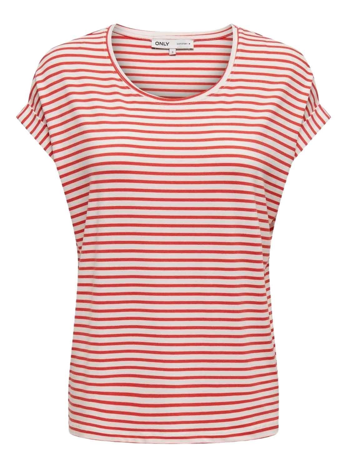Camiseta Only. Modelo Moster. Estampa listrada em vermelho e branco. Gola larga. Manga curta.