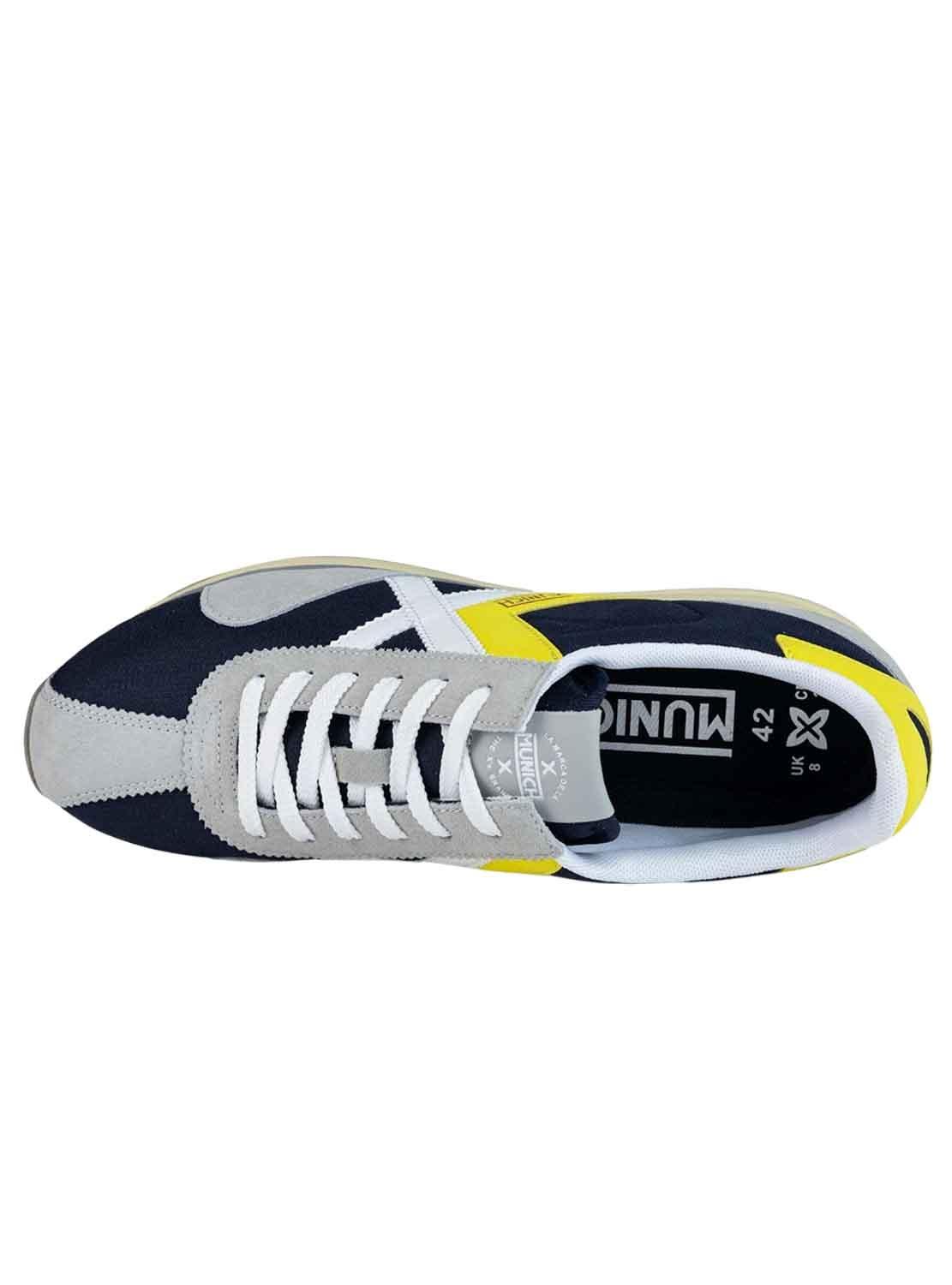 Sapatilhas Munich. Modelo Sapporo 174. Cor azul marinho, cinza, amarelo e branco. Fechamento com cadarço. Entressola em EVA. Sola de borracha antiderrapante. Lado Logo. Aparência vintage. Tecido de malha.