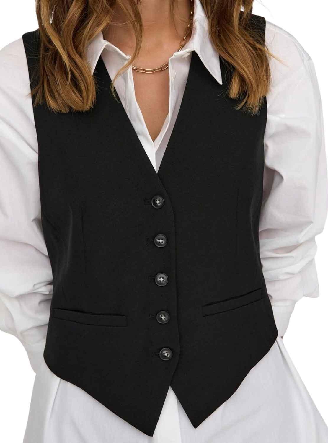 Colete Only. Modelo Diana. Cor preto. Fecho de botão. Sem mangas. Ajustável nas costas. Estilo recortado. Gola V.