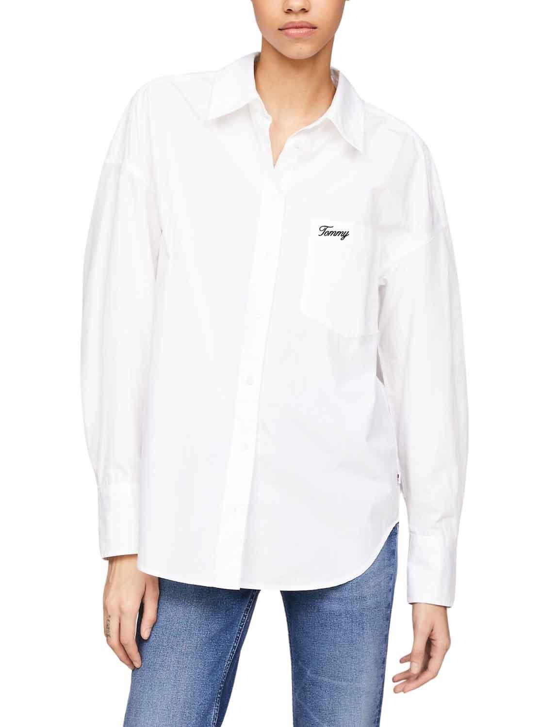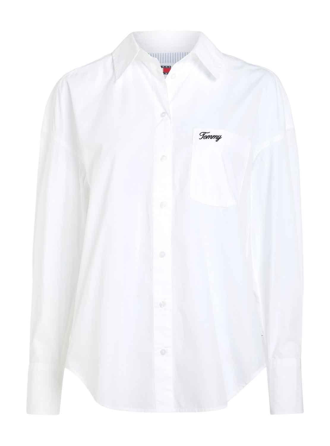 Camisa Tommy Jeans. Modelo Script. Cor branca. Manga comprida. Fecho de botões. Bolso com o logotipo da marca no peito. Corte oversized.