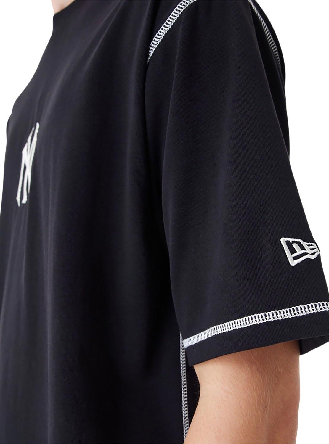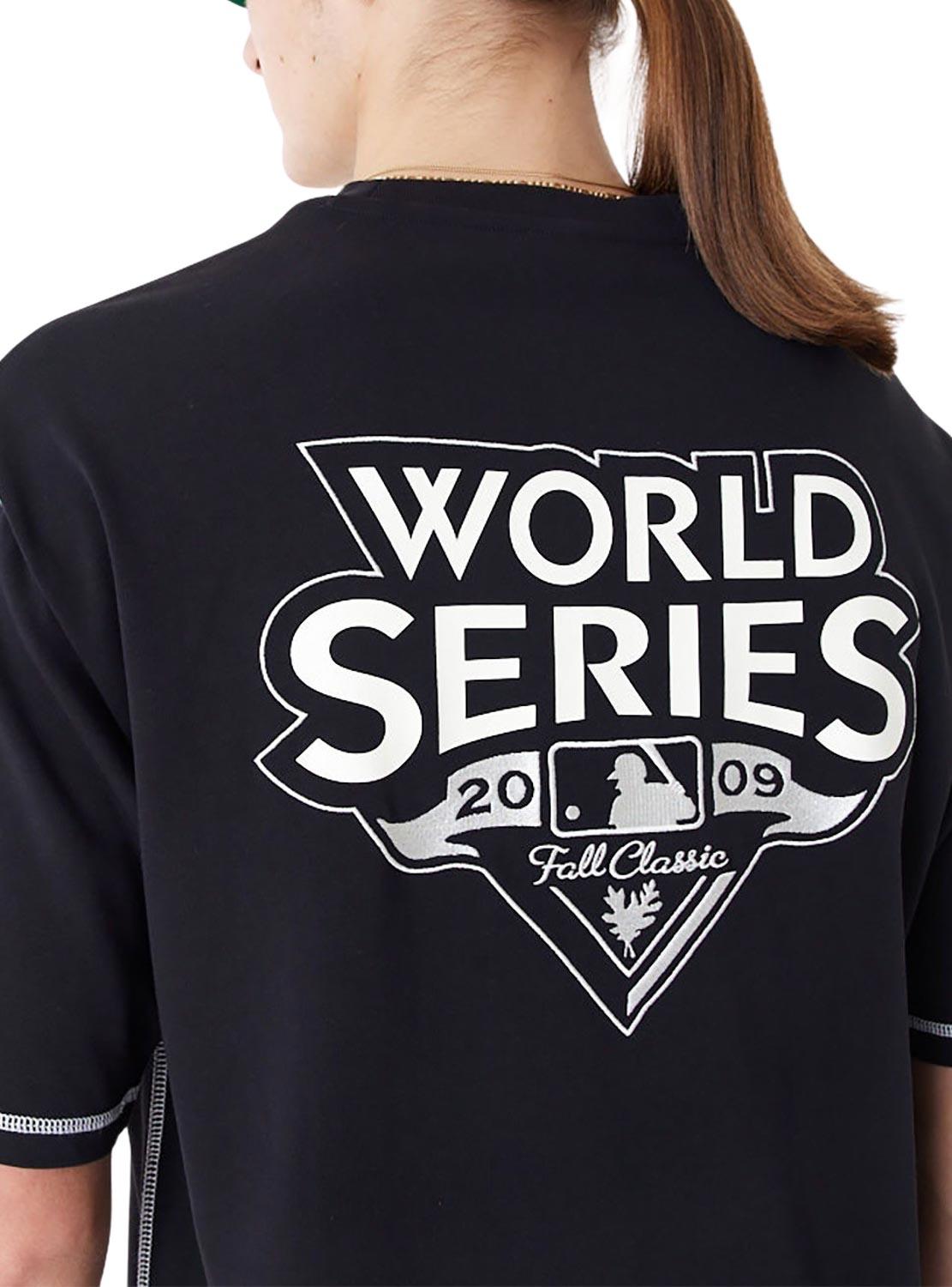 Camiseta New Era. Modelo New York Yankees MLB. Cor preta. Gola redonda elástica. Logotipo no peito. Manga curta. Costuras em contraste. Ombros caídos. World Series 2009 Oversized. O modelo veste tamanho M.