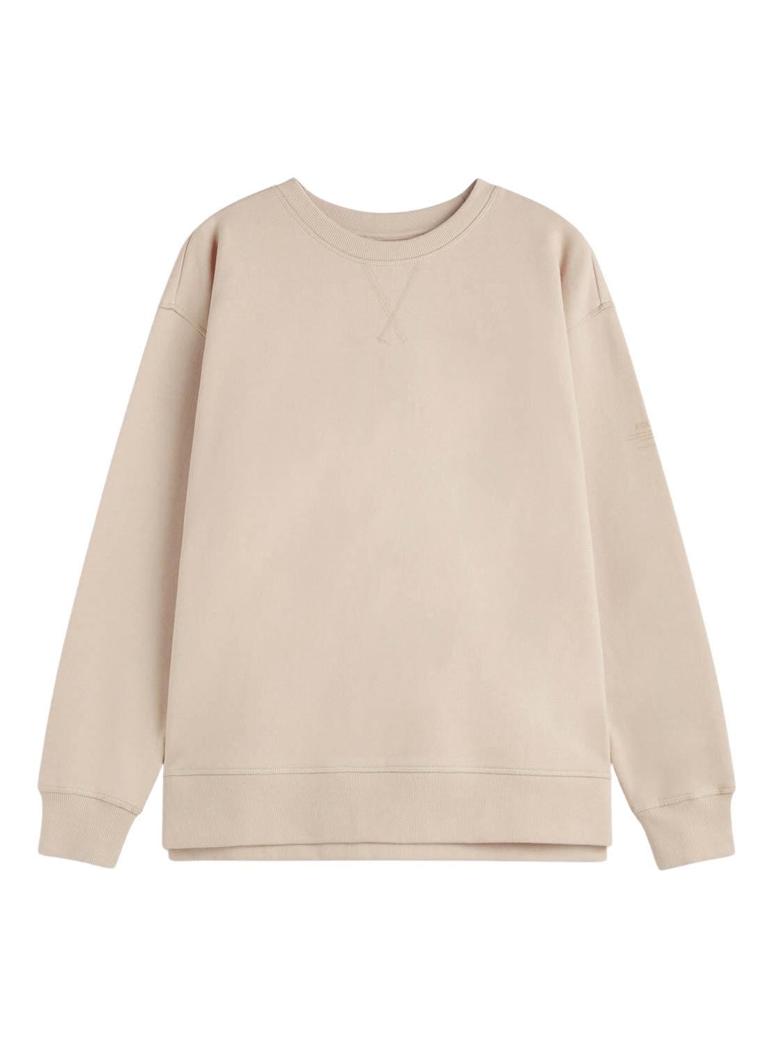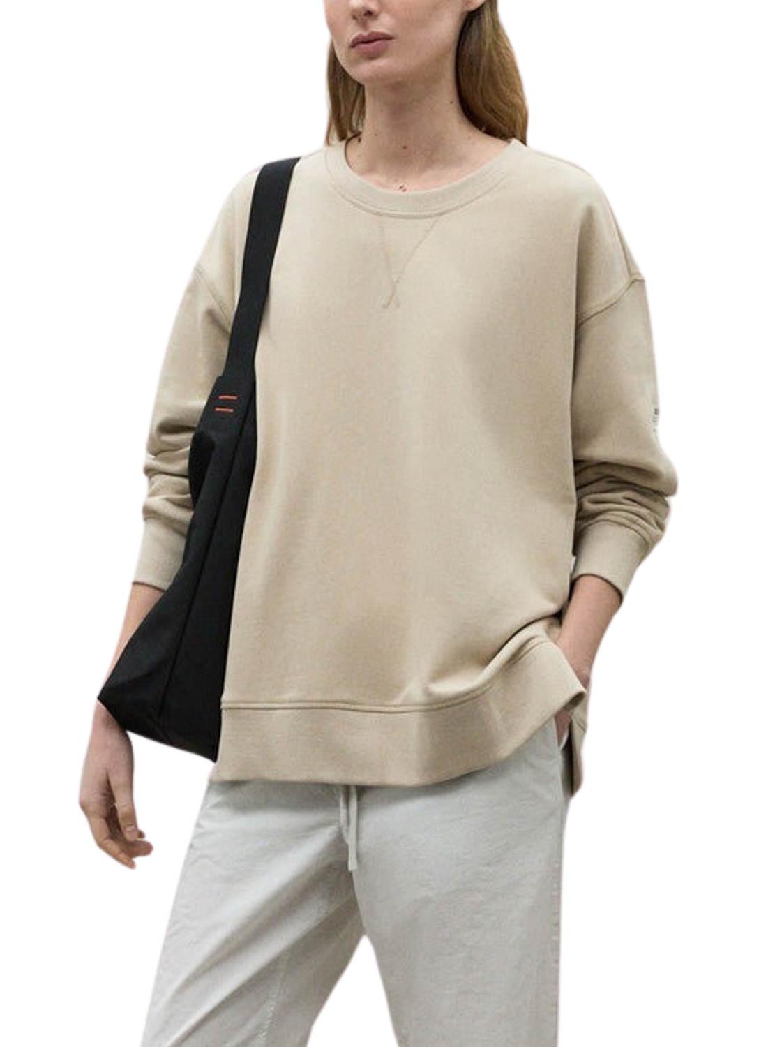 Moletom Ecoalf. Modelo Moss. Cor bege. Gola redonda elástica. Remendo no peito. Ombros caídos. Extremidades elásticas. Estampado nas costas. Ajuste folgado. Texto Porque não há planeta B. Vegano.
