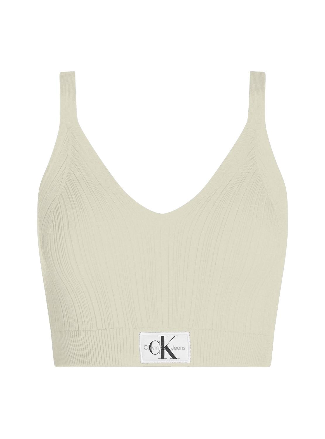 Top Calvin Klein. Modelo Woven Label. Cor bege (Green Haze). Decote em V. Etiqueta com logo no peito. Tecido elástico. Estilo cropped. O modelo veste tamanho S.