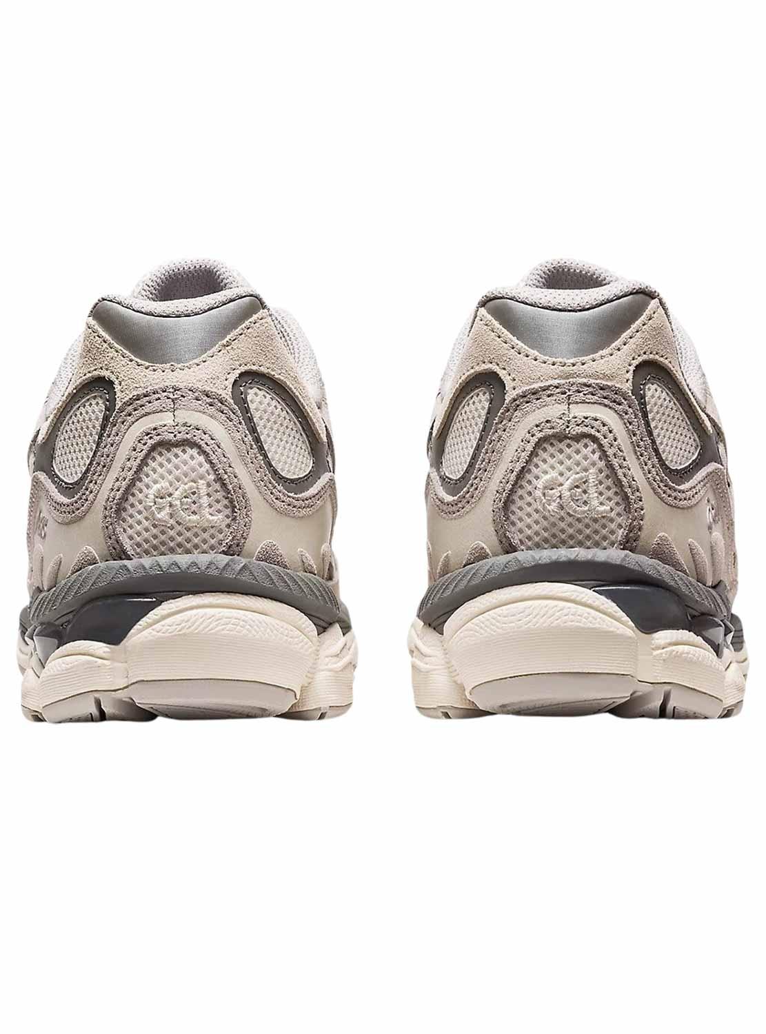 Tênis Asics. Modelo GEL-NYC. Cor cinza e branco. Inspirado nos modelos tradicionais e modernos de corrida de alto desempenho. Entressola combinada com espumas leves e inserções com tecnologia Gel. Fecho com cordões.