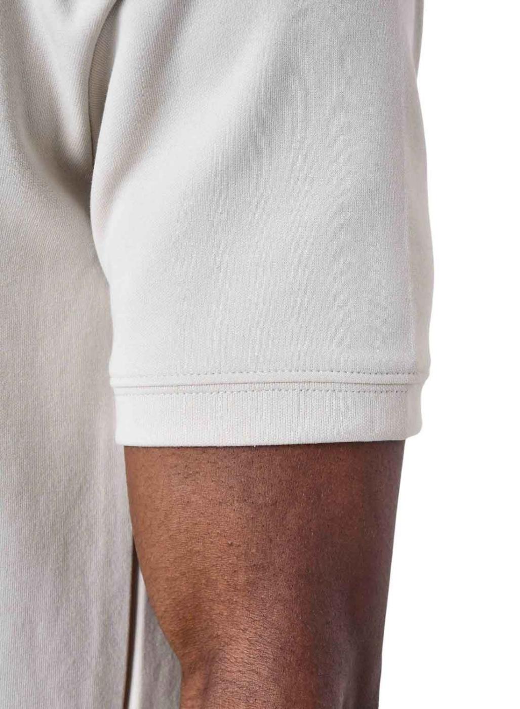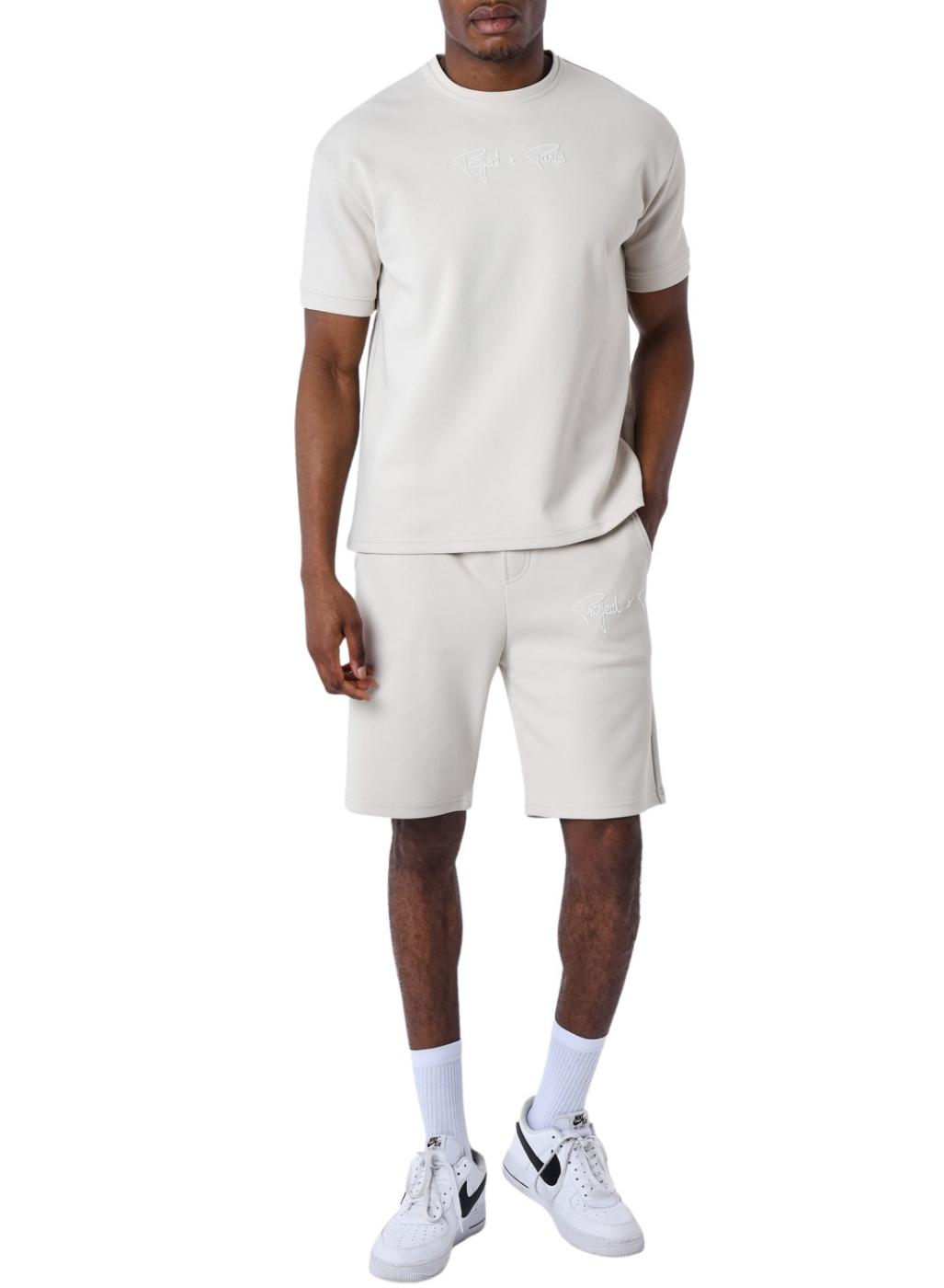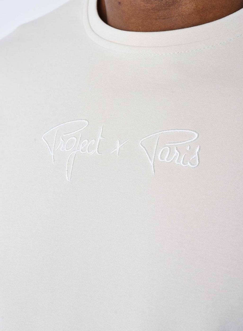 Camiseta Proyect x Paris. Modelo Weight. Cor bege. Logotipo bordado na cor. Ajuste folgado. Manga curta. Tecido grosso.