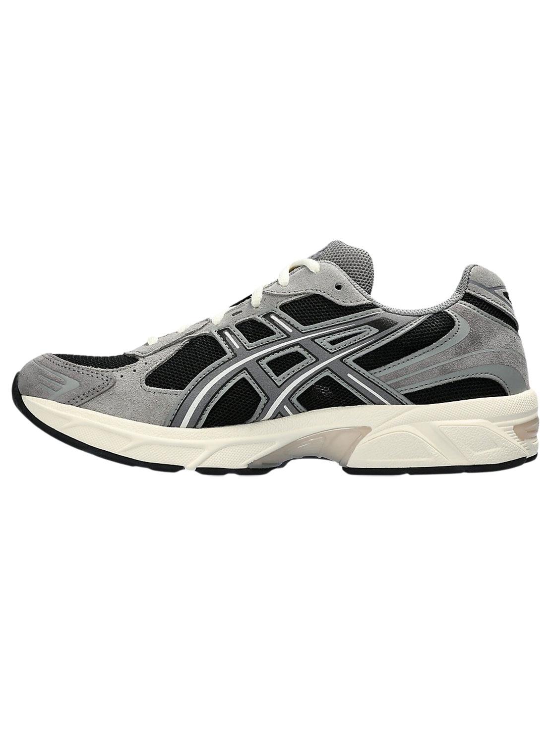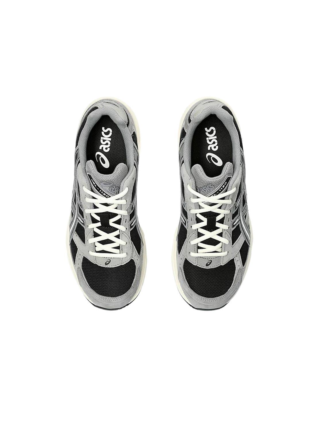 Sapatilhas Asics. Modelo Gel 1130. Cor preto. Painéis em cinza. Fecho com cordões. Estilo futurista. Entressola de EVA. Sola de borracha.
