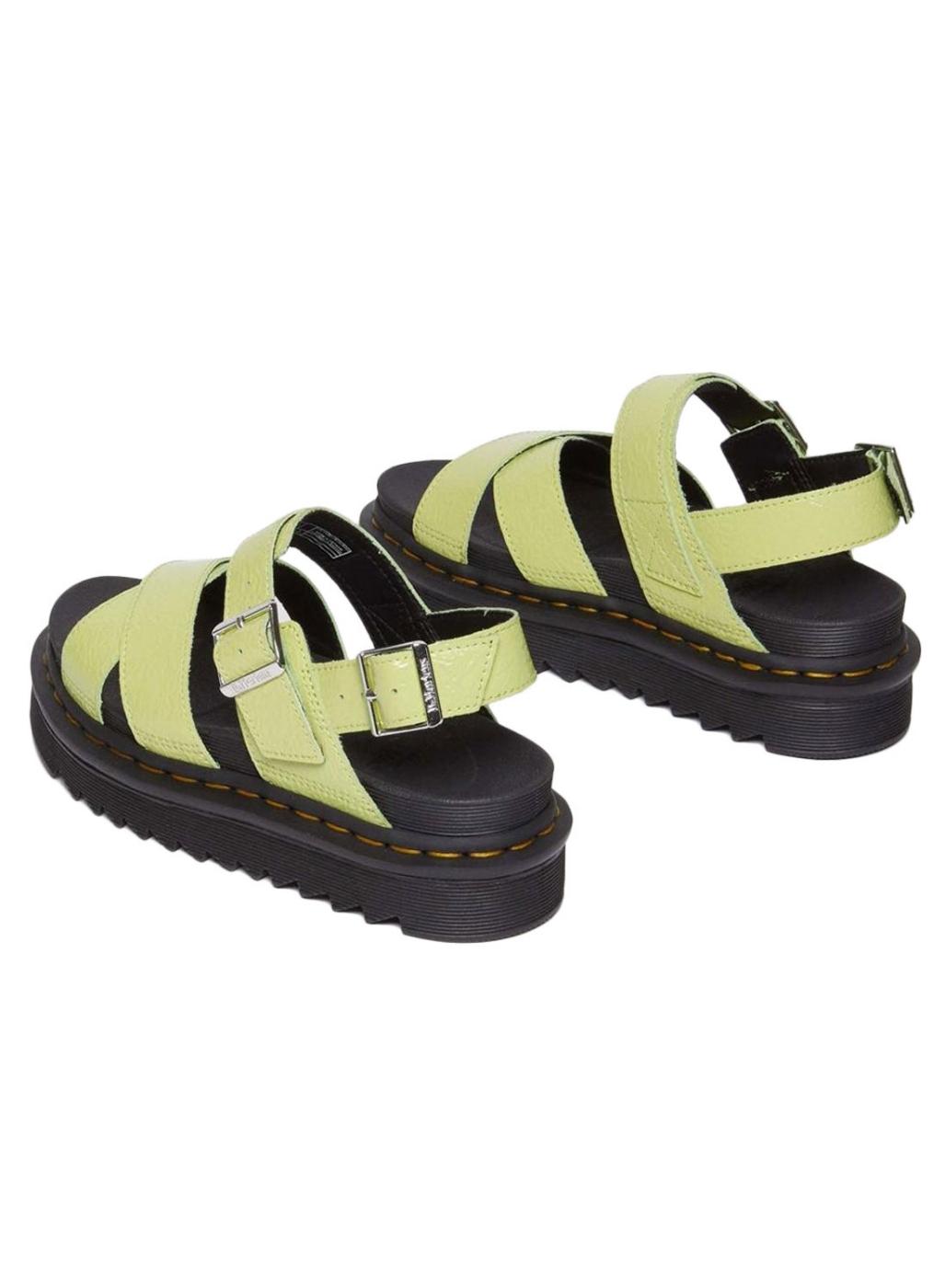 Sandálias Dr. Martens. Modelo Voss II. Cor lima. Fecho com fivelas metálicas. Sola ziggy leve. Costura emblemática. Palmilha Goodyear welted. Plataforma com altura de 4cm.