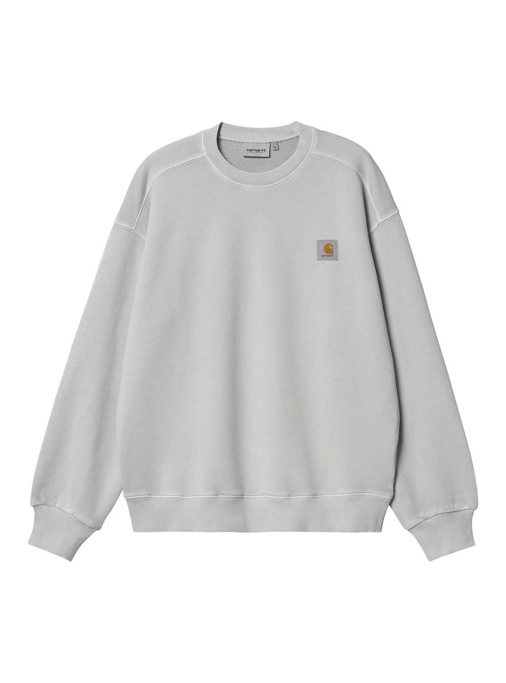 Moletom Carhartt. Modelo Nelson. Cor cinza. Efeito desgastado. Costuras em contraste. Patch da marca no peito. Ajuste folgado. Extremidades caneladas.