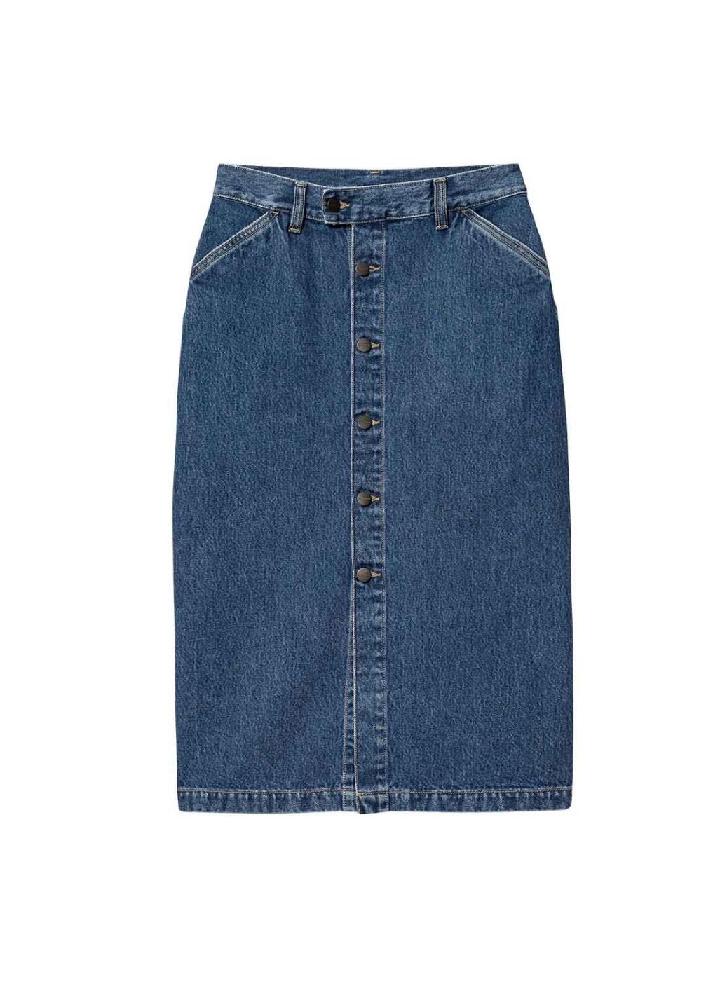 Saia Carhartt. Modelo Colby. Jeans médio. Corte midi. Estilo cargo. Fecho de botão e zíper. Bolsos laterais. Bolsos traseiros com patch da marca.