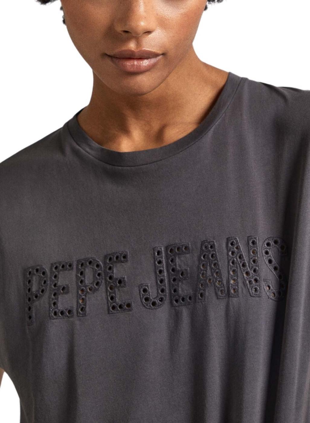 Camiseta Pepe Jeans. Modelo Lilith. Cor cinza infinito. Mangas curtas. Gola redonda elástica. Logotipo no peito. Tecido de malha de algodão. Corte boxy. Manga regata. Ombros caídos. Tecido de sarja no interior. O modelo veste o tamanho S.