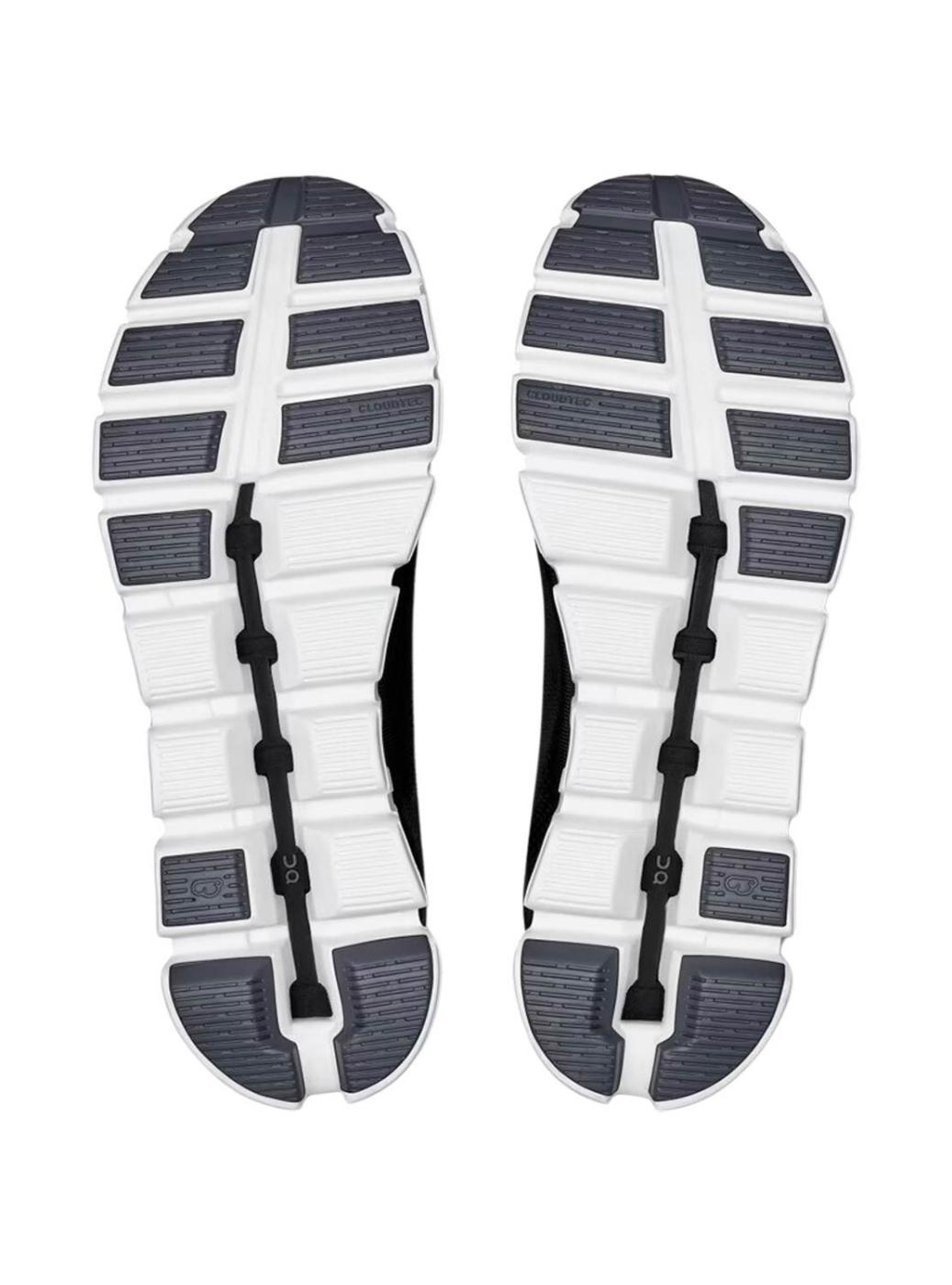 Sapatilhas On. Modelo Cloud 5. Cor preto. Fecho com cordões elásticos. Logotipo lateral. Painel traseiro em contraste cinza. Sola leve de borracha antiderrapante. Painéis de malha.