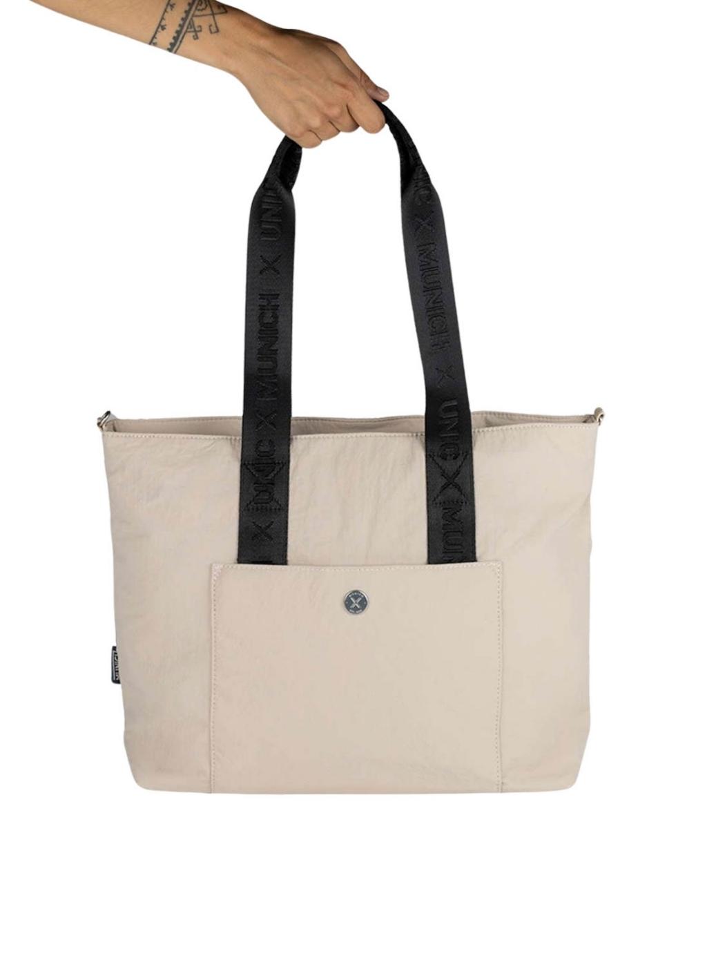 Bolsa Munich. Modelo Bloom shopper. Cor creme. Nylon macio. Puxadores personalizados em PU e bordas em contraste. Alças de ombro adicionais ajustáveis em nylon. Bolso frontal com fecho magnético escondido. Capacidade para laptop de 15,6 polegadas. Interior com bolso com zíper e dois compartimentos pequenos.