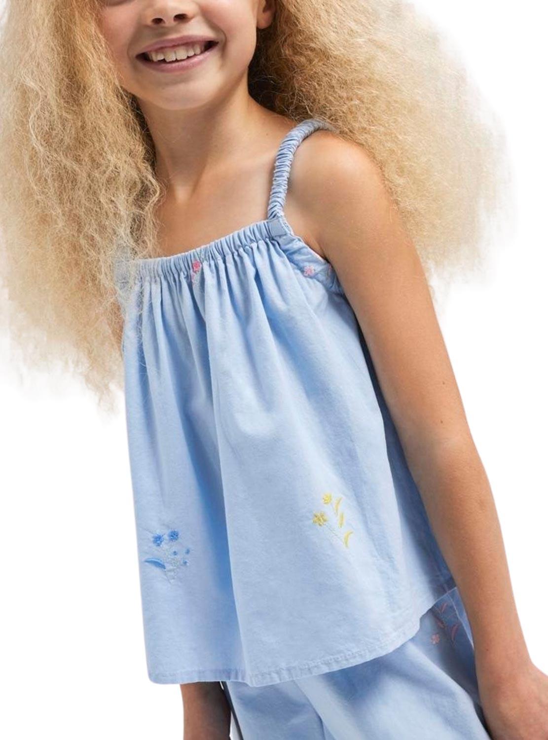 Top Name It. Modelo Falower. Cor azul. Sem mangas. Com alças. Detalhes bordados.