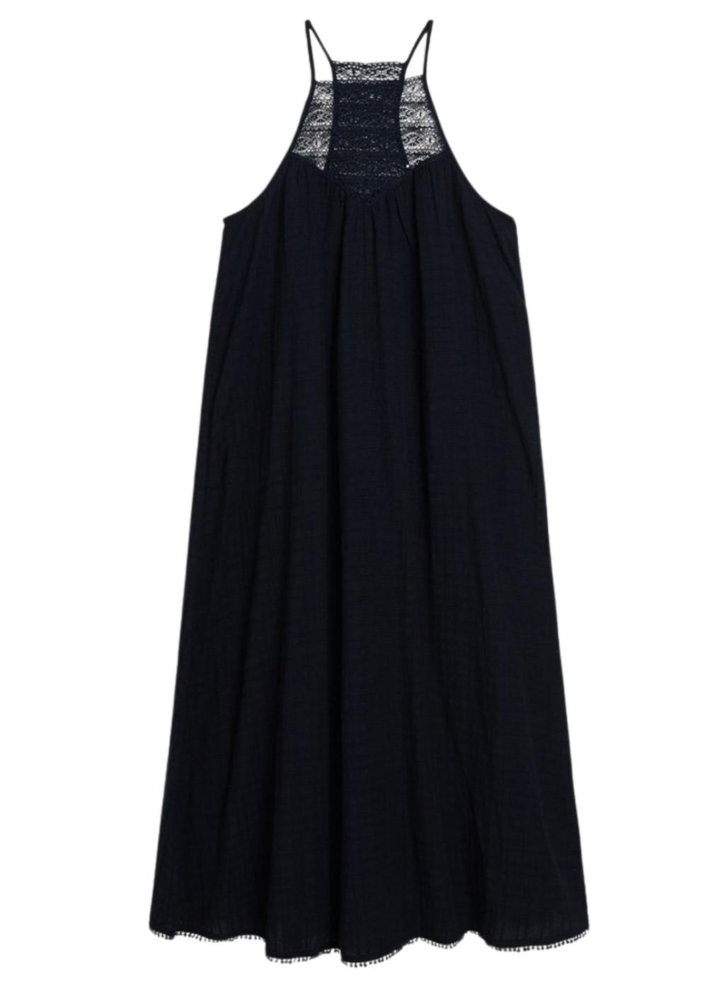 Vestido Superdry. Modelo Maxi Dress. Cor azul marinho. Sem mangas. Decote aberto nos ombros. Com alças. Corte regular.