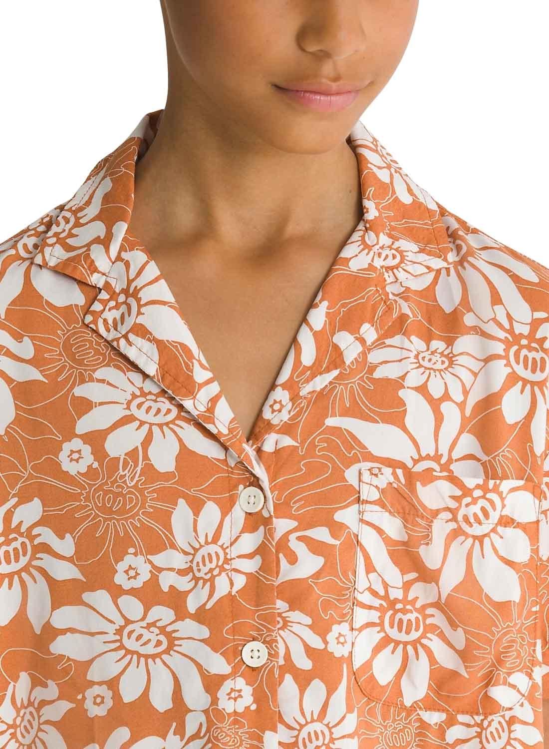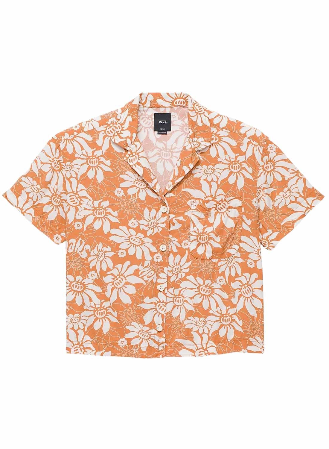 Camisa Vans. Modelo Amstone. Cor laranja. Fecho com botões. Corte quadrado. Bolso no peito. Estampa tropical com marca.