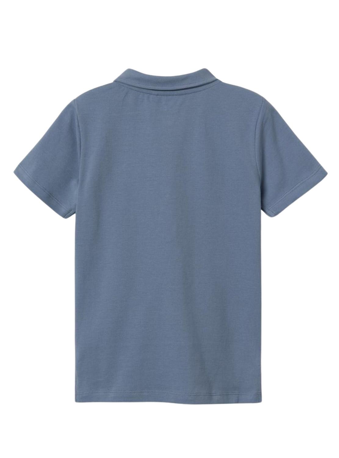Camisa Polo Name It. Modelo Valde. Cor azul. Gola de polo. Manga curta. Abotoamento com 3 botões. Logotipo bordado no peito. Corte regular.