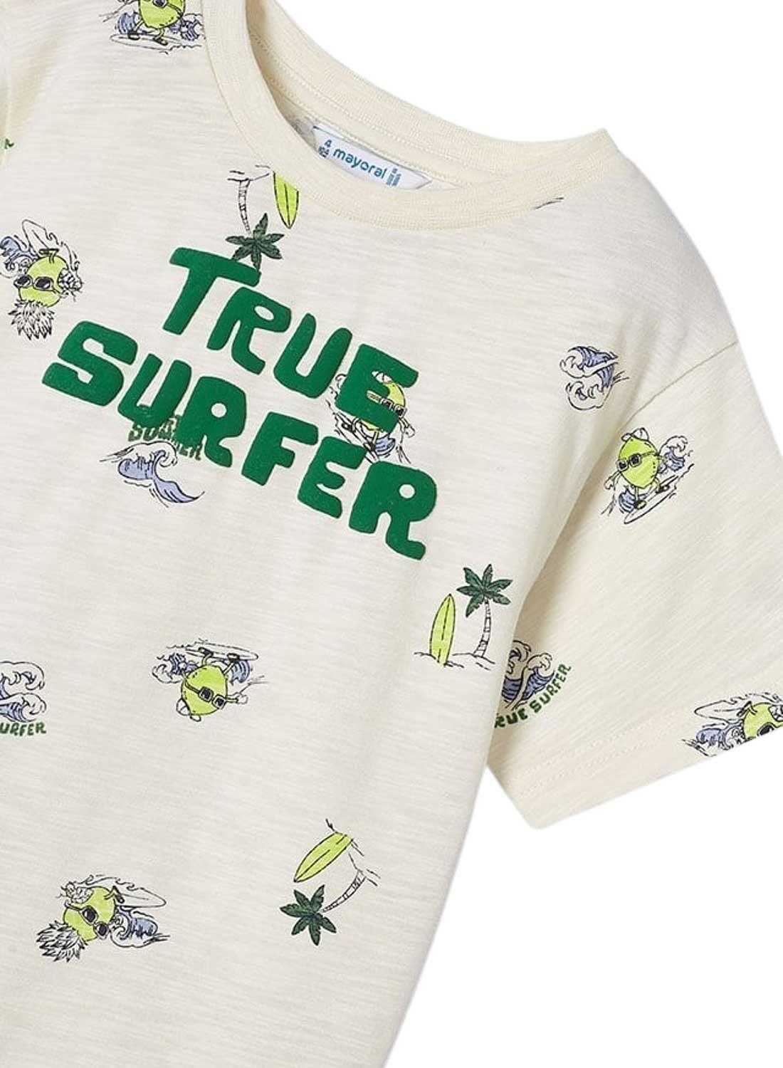 Camiseta Mayoral. Modelo True Surfer. Cor branca. Manga curta. Gola redonda. Estampado em toda a peça. Impressão gráfica no peito. Corte regular.