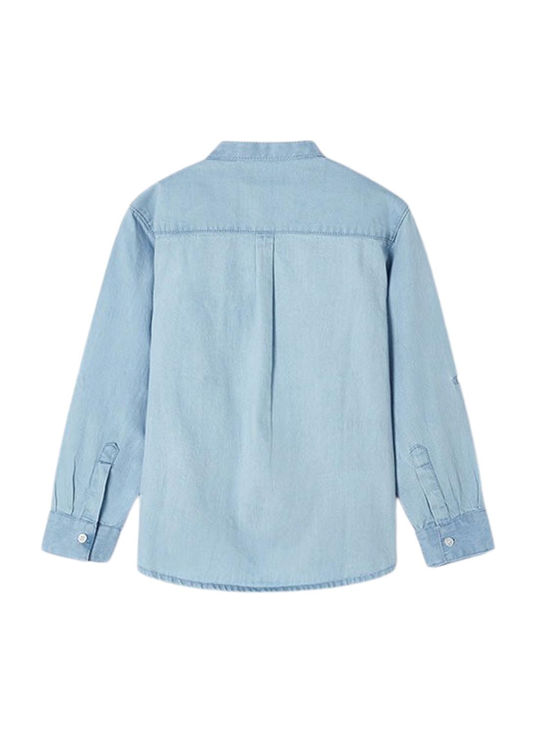 Camisa Mayoral. Modelo Denim. Cor azul. Manga comprida. Gola mao. Fecho de botões. Bolso no peito. Corte regular.