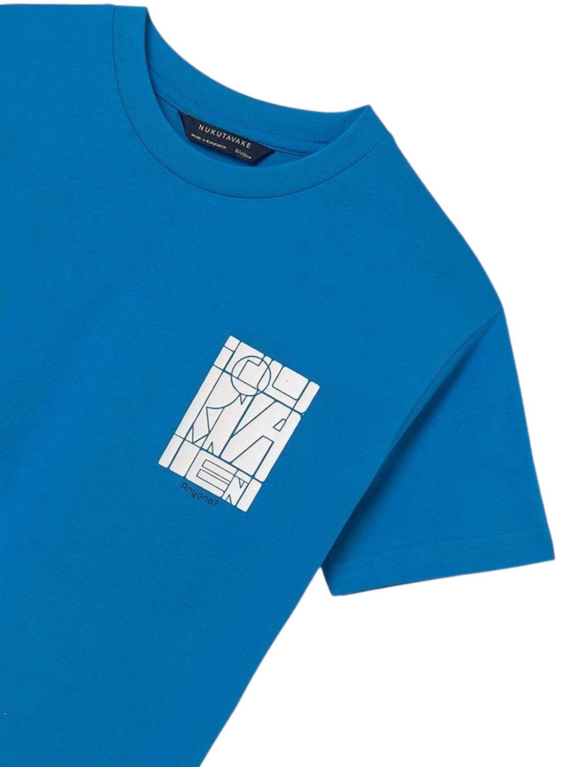 Camiseta Mayoral. Cor azul. Gola redonda. Manga curta. Estampa na parte de trás. Estampa no peito. Formato regular.