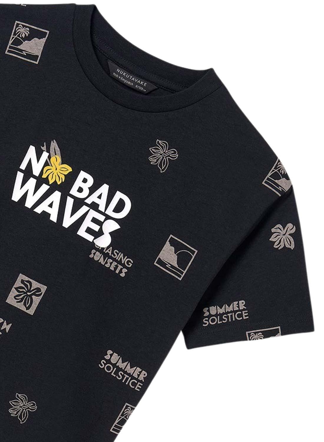 Camiseta Mayoral. Cor cinza. Gola redonda. Manga curta. Estampa surfista em toda a peça. Texto estampado no peito. Formato regular.