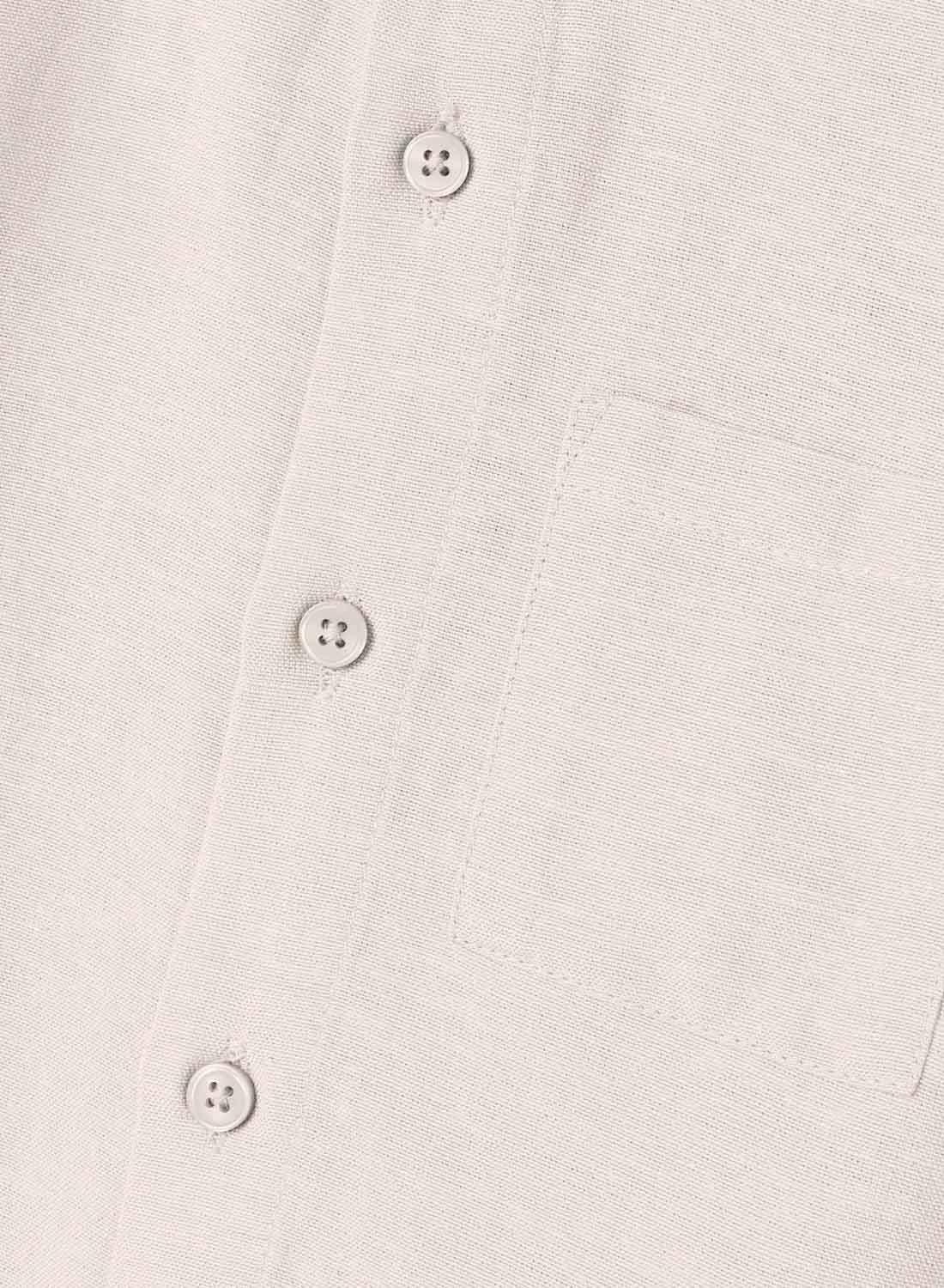 Camisa Name It. Cor bege. Tecido de linho. Gola mao. Manga curta. Fecho frontal com botões. Bolso no peito. Corte regular.