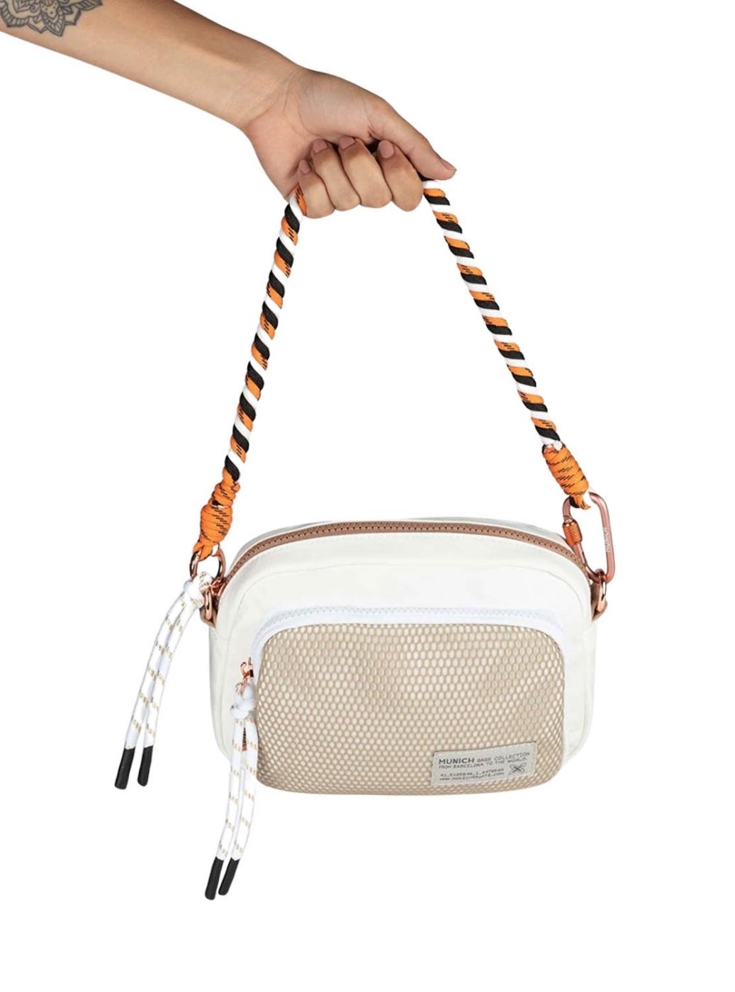 Bolsa transversal Munich. Modelo Camera Deep. Cor branca. Fechamento com zíper. Dois compartimentos. Alça ajustável. Puxadores com detalhes de cordas coloridas e acabamento em silicone.