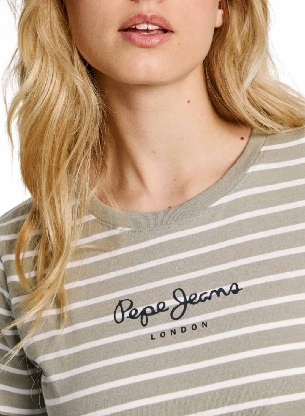 Camiseta Pepe Jeans. Modelo Elba. Cor verde e branco. Listras horizontais. Logotipo estampado no peito. Manga curta. Gola redonda. Ajuste apertado.