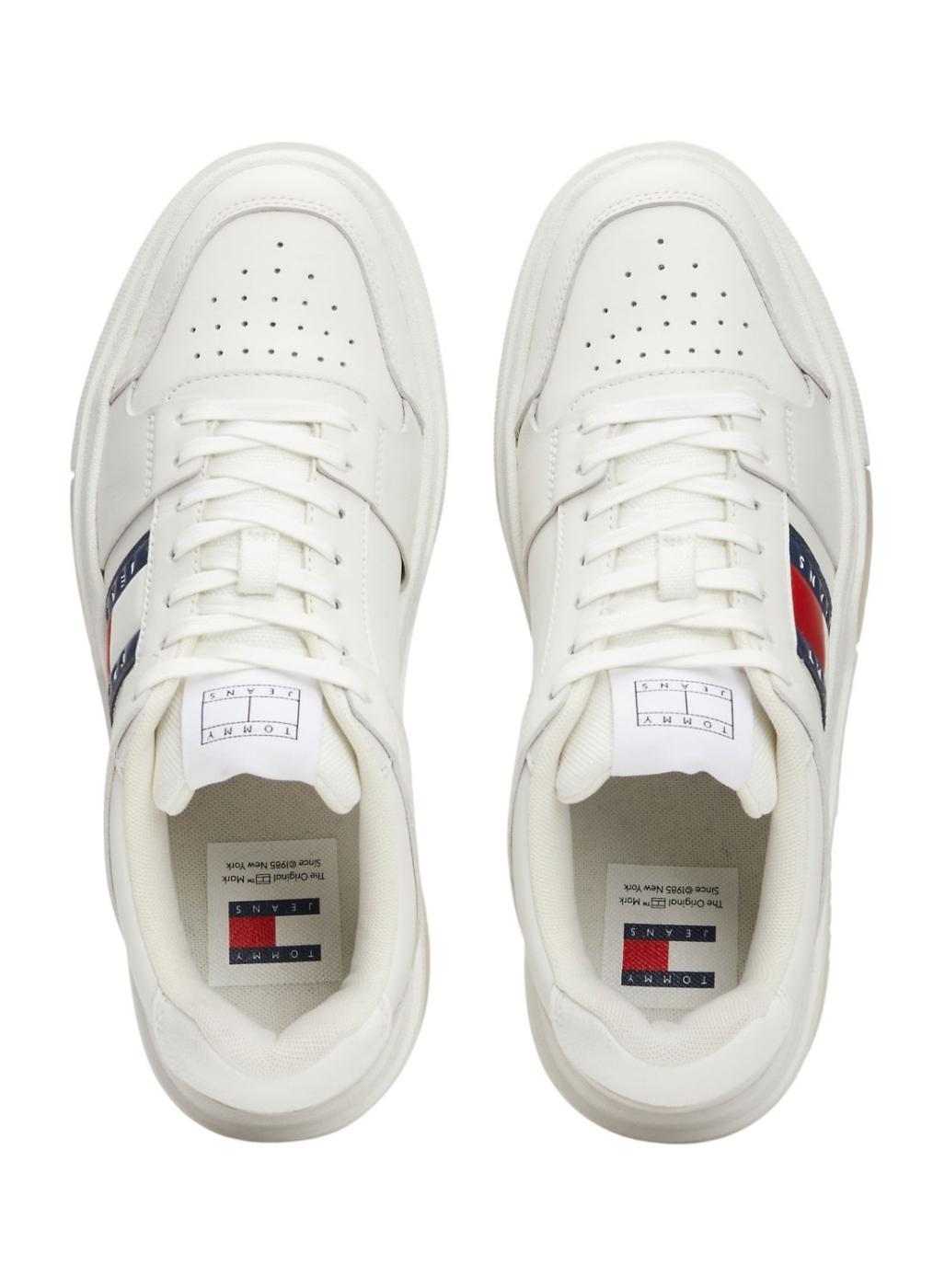 Sapatilhas Tommy Jeans. Modelo Brooklyn. Cor branca. Fecho com cordões. Logotipo lateral. Sola de borracha. Estilo basquete. Ilhós de ventilação na biqueira.