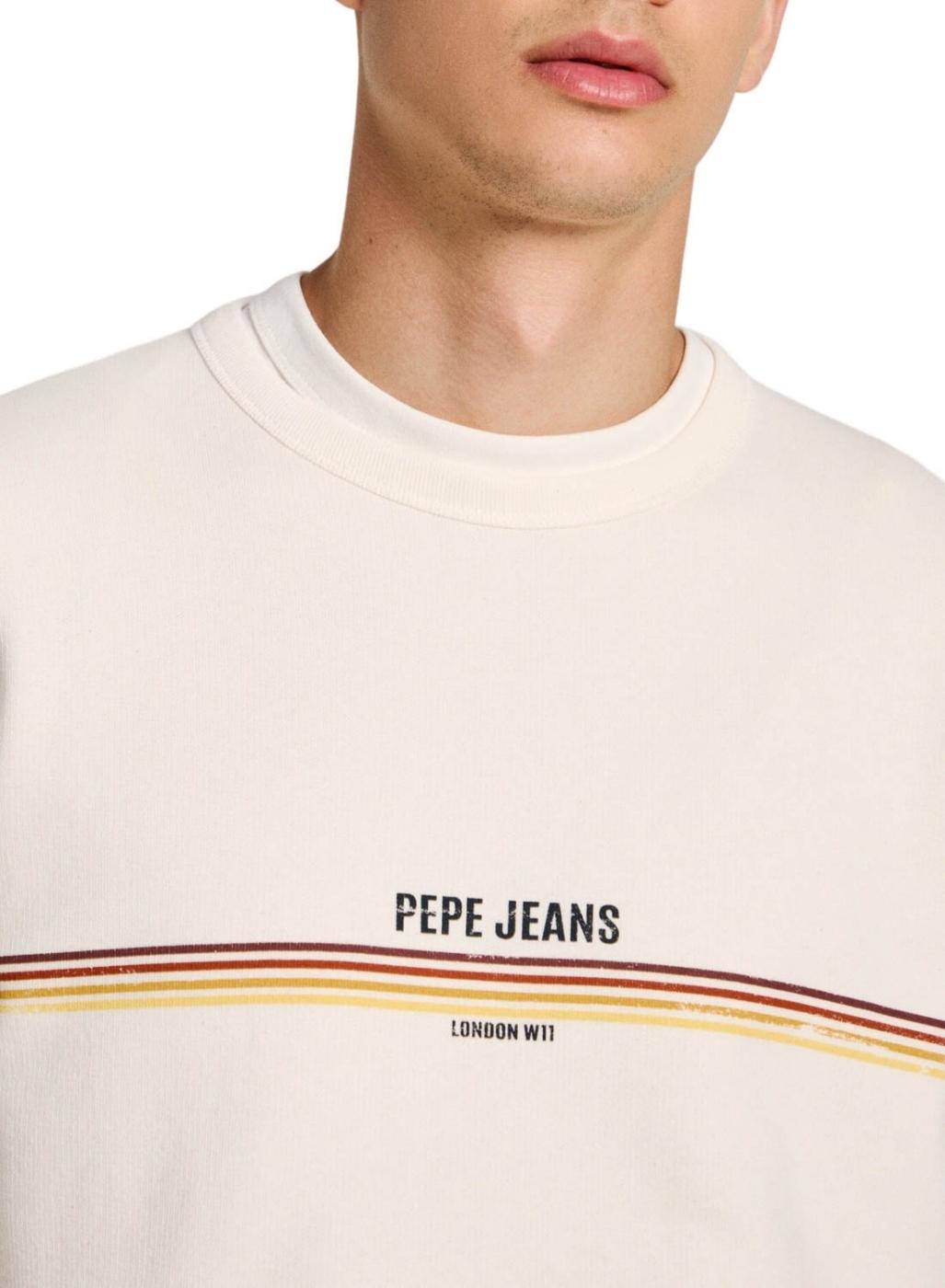 Camisola Pepe Jeans. Modelo Sander. Branco quebrado. Gola redonda. Ajuste folgado. Marca estampada. Listras multicoloridas no peito.