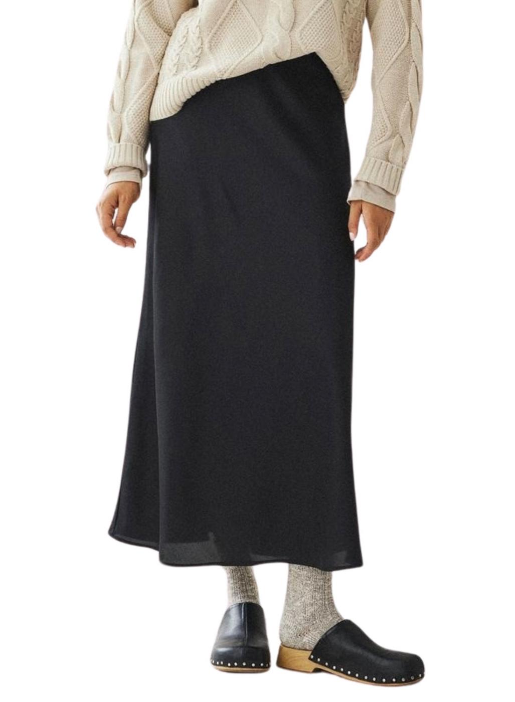 Saia Vila. Modelo Viellette. Cor preta. Tecido acetinado. Cintura com elástico interno. Corte midi.
