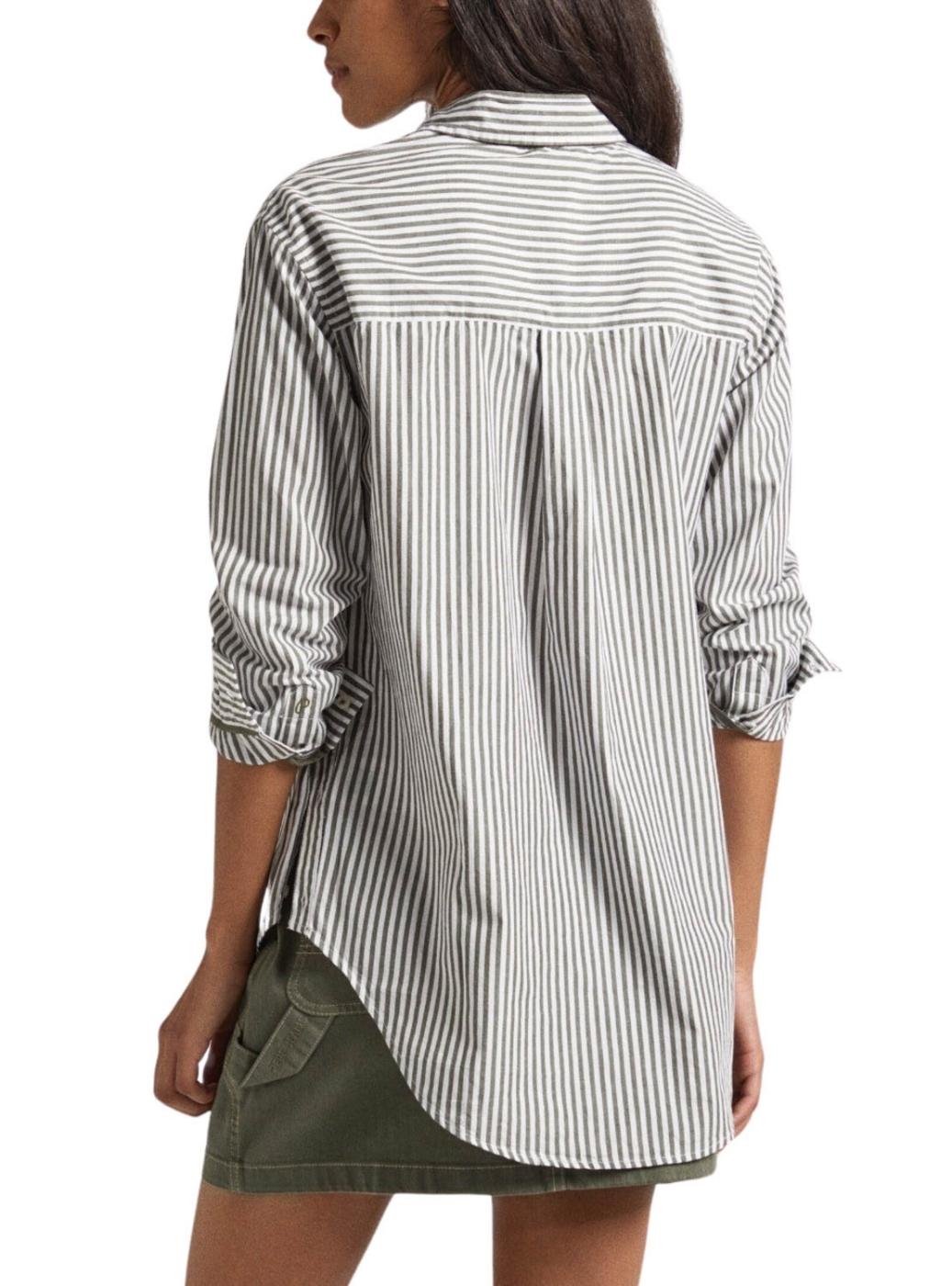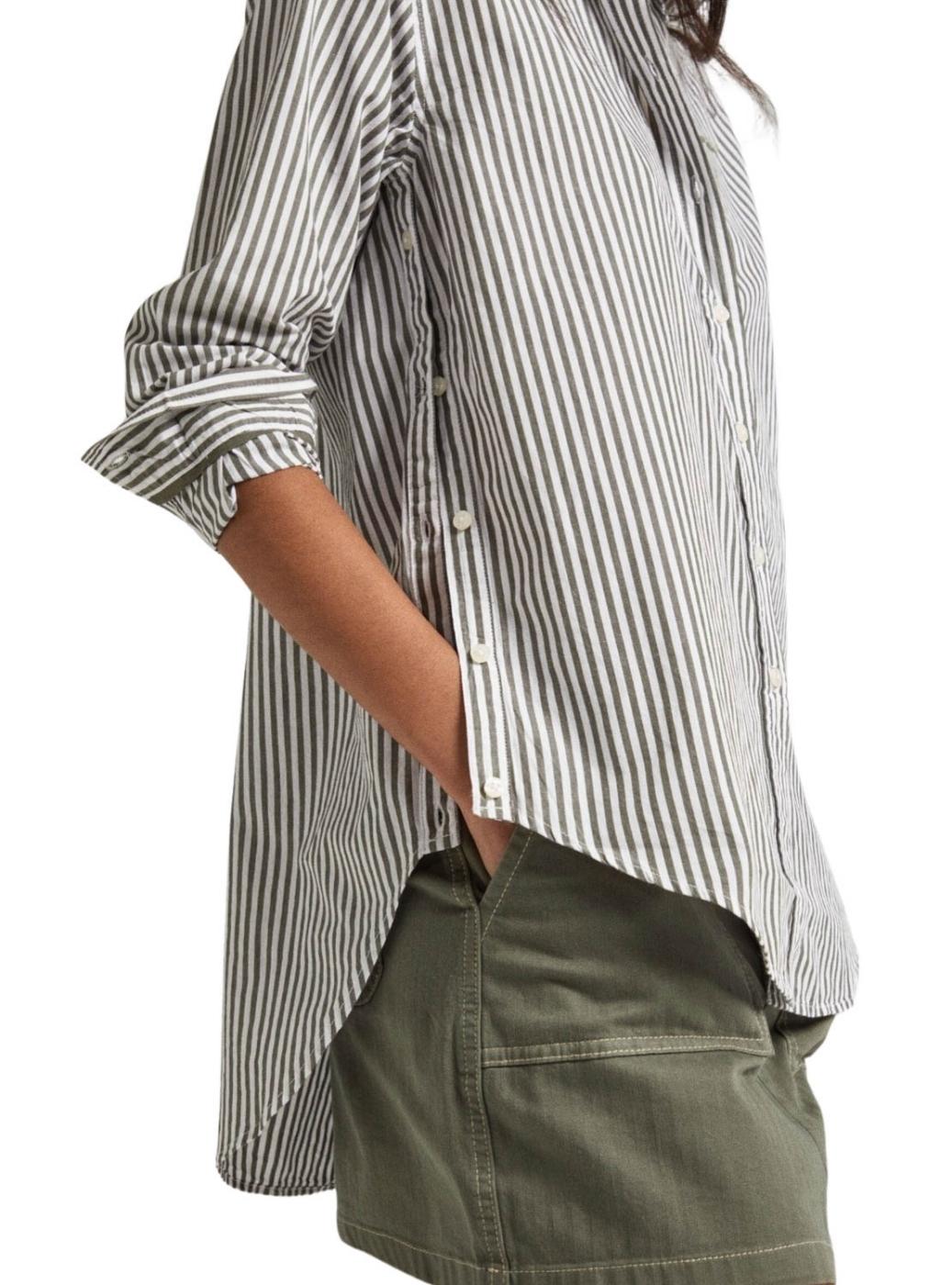 Camisa Pepe Jeans. Modelo Bryce. Cor branca e verde. Fechamento com botões. Logotipo bordado no peito. Aberturas laterais com botões. Estampado com listras verticais.