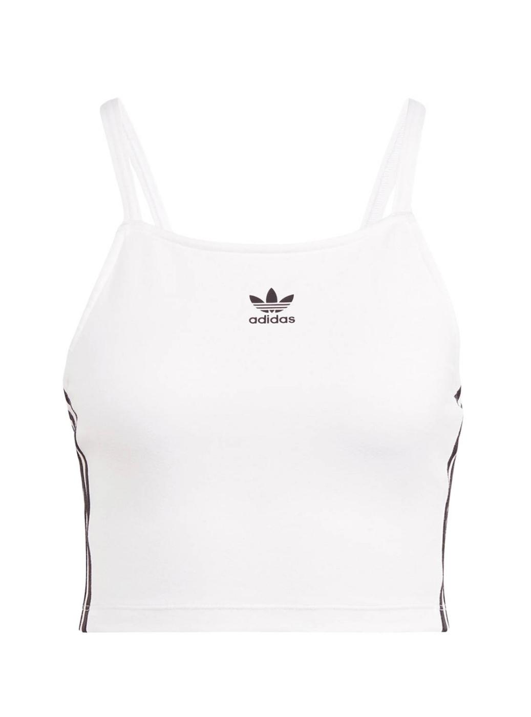 Top Adidas. Modelo Adicolor. Cor branca. Ajuste apertado. Decote quadrado. Com alças. Faixas em contraste de cada lado.