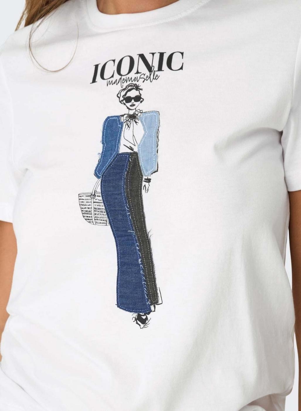 Camiseta Only. Modelo Emma. Cor branca. Manga curta. Gola redonda. Ajuste regular. Ilustração ICONIC estampada no peito.