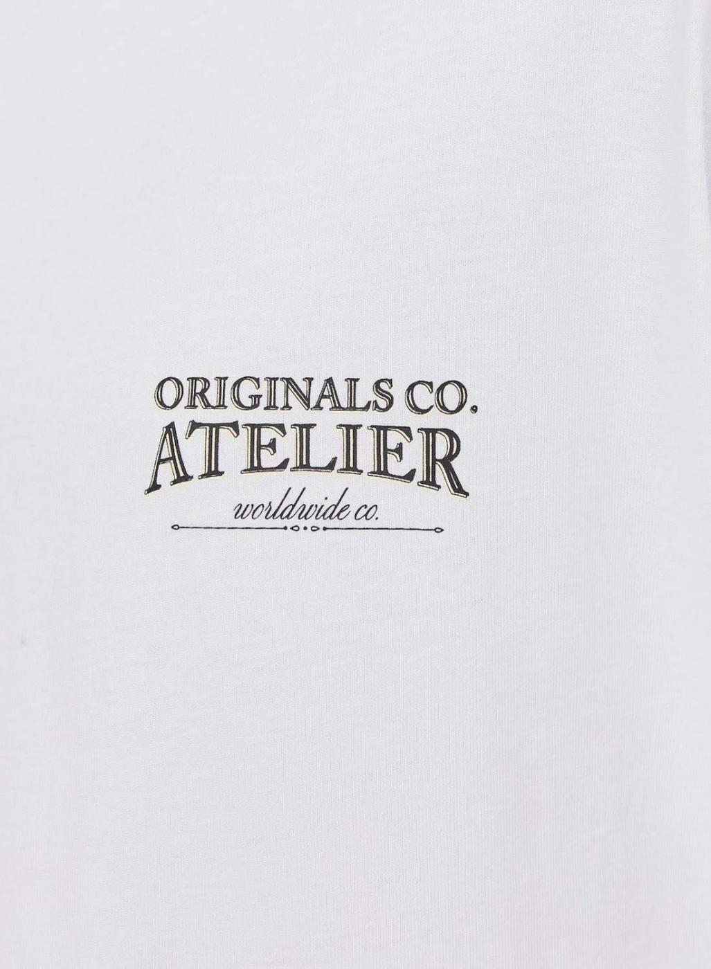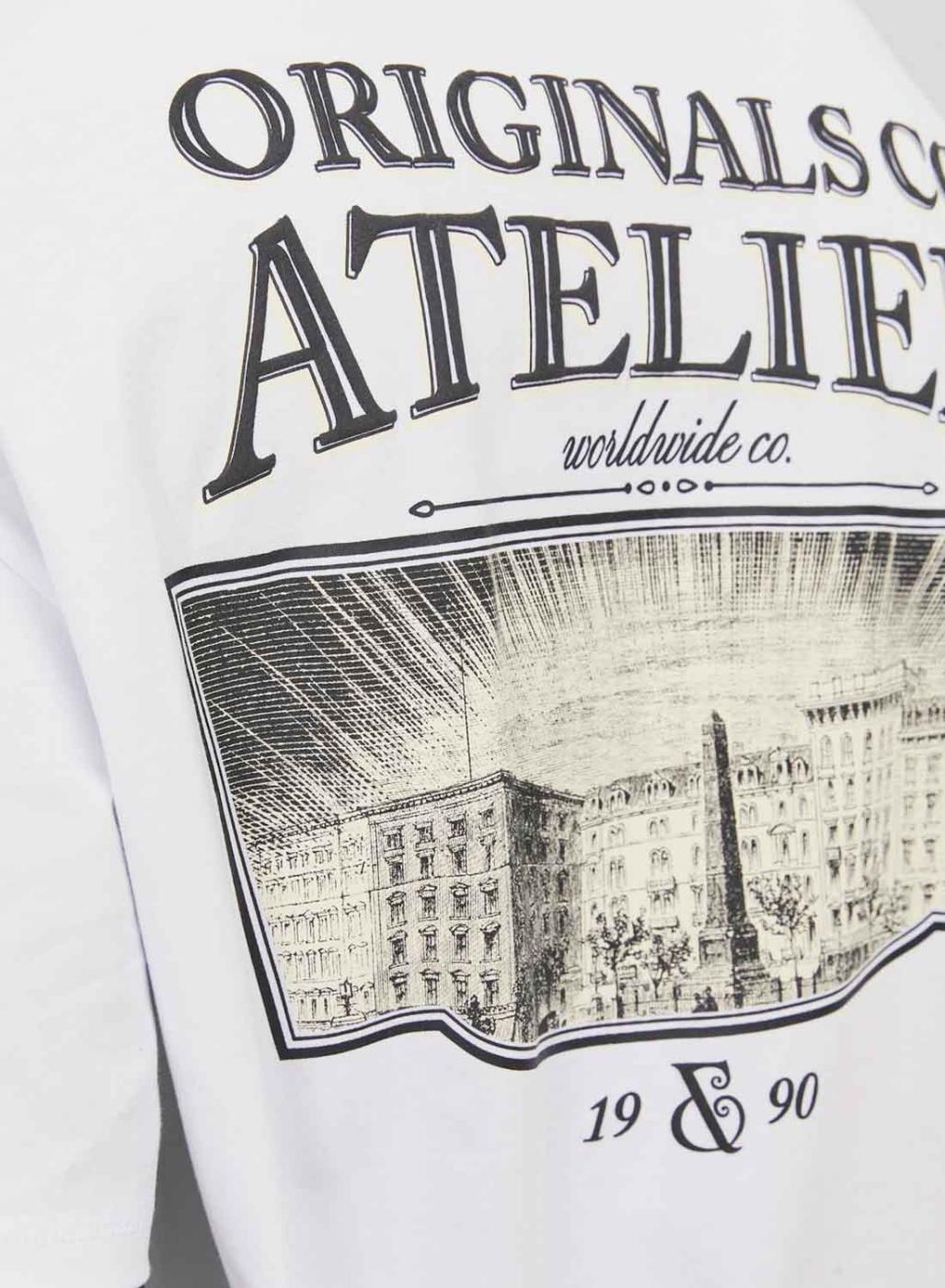 Camiseta Jack and Jones. Modelo Santorini. Cor branca. Mensagem estampada no peito. Ilustração vintage estampada nas costas. Ajuste folgado.