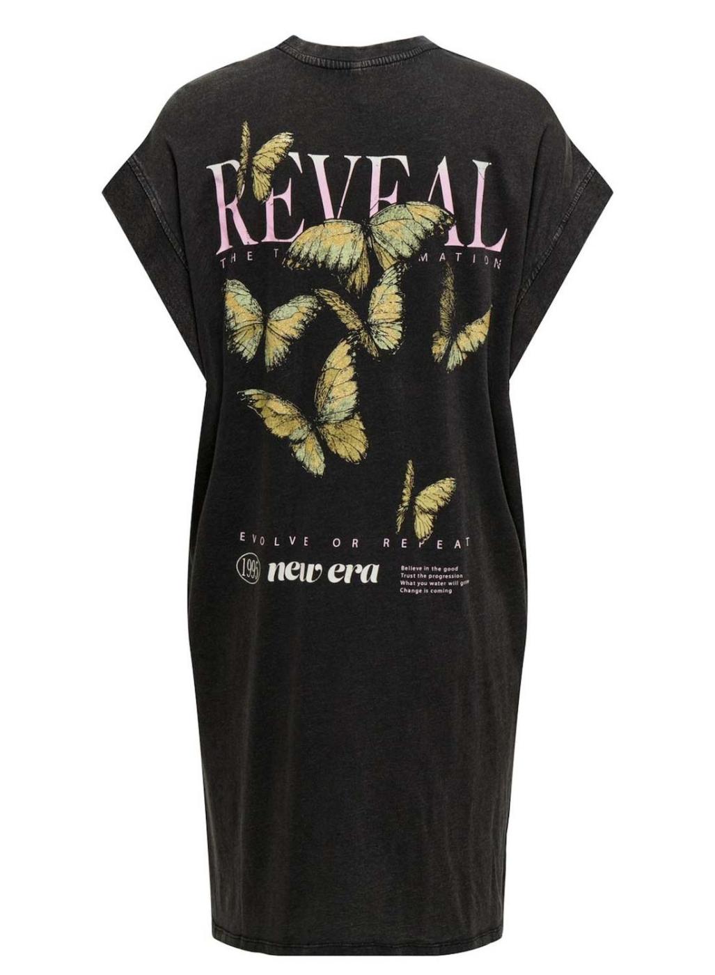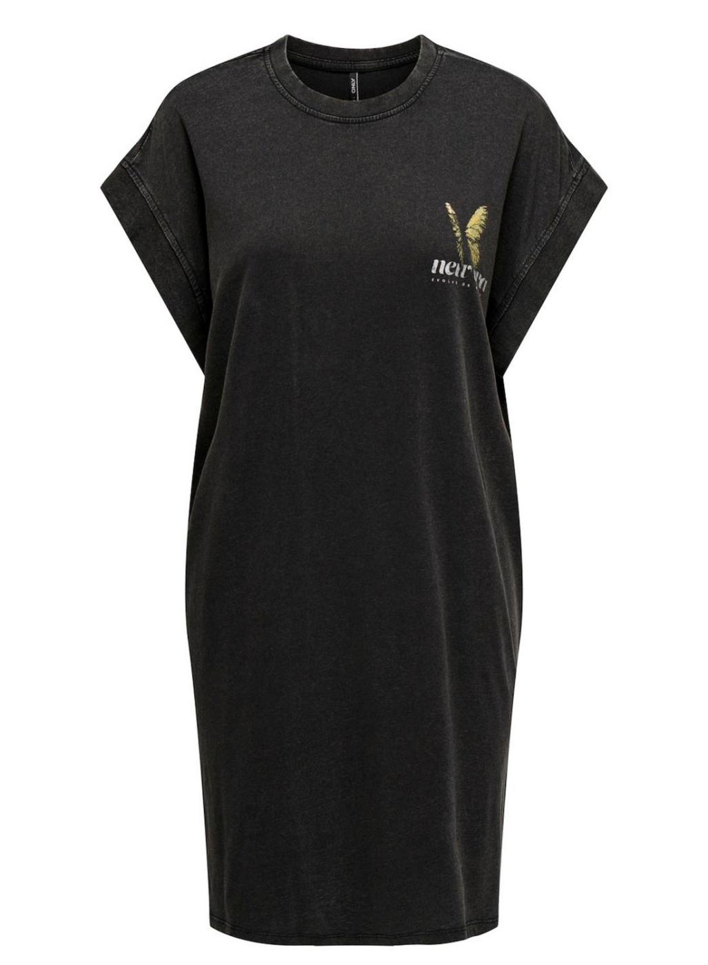 Vestido Only. Modelo Lucy. Cor preta. Efeito desgastado. Gola redonda. Manga curta. Ombros caídos. Estampa nas costas. Estampa no peito. Corte mini.