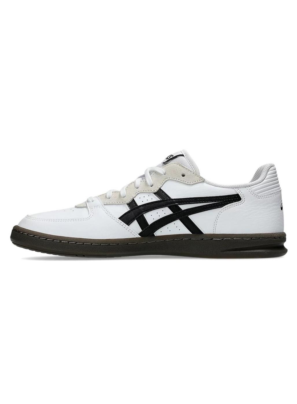 Sapatilhas Asics. Modelo Skyhand OG. Cor branca. Inspiradas no icónico tênis de handebol. Painéis de couro sintético e camurça. Sola de borracha. Amortecimento FLYTEFOAM PROPEL. Calcanhar com amortecimento EVA. Detalhes da marca em preto. Sola marrom escuro.