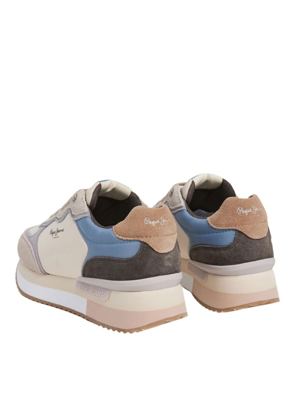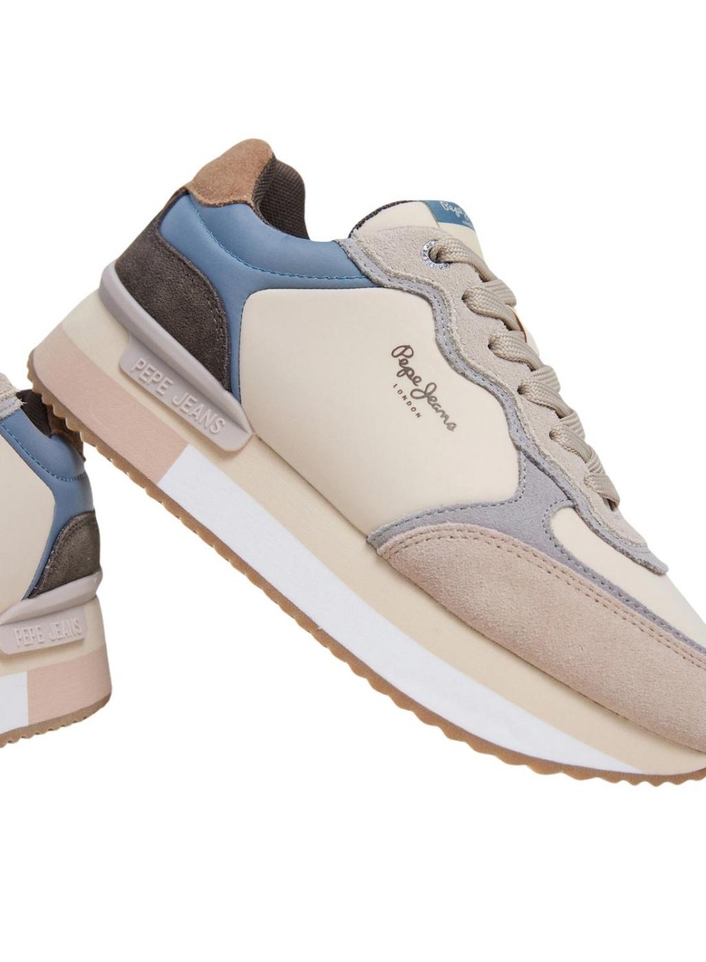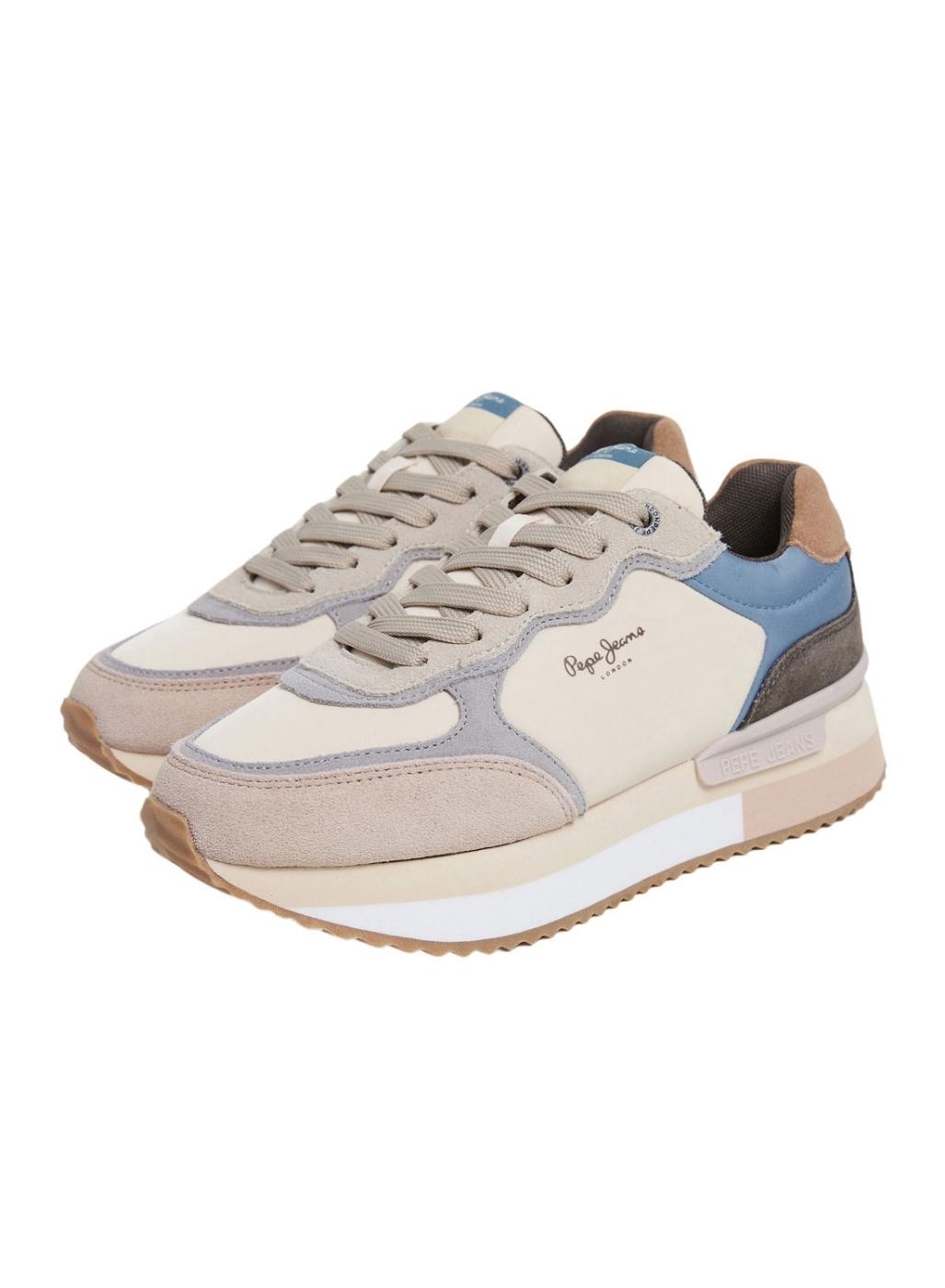 Sapatilhas Pepe Jeans. Modelo Rusper Mania. Cor bege, rosa e azul. Painéis em camurça. Sola de borracha. Entressola de EVA. Fecho com cordões. Logo lateral. Altura de 3cm.