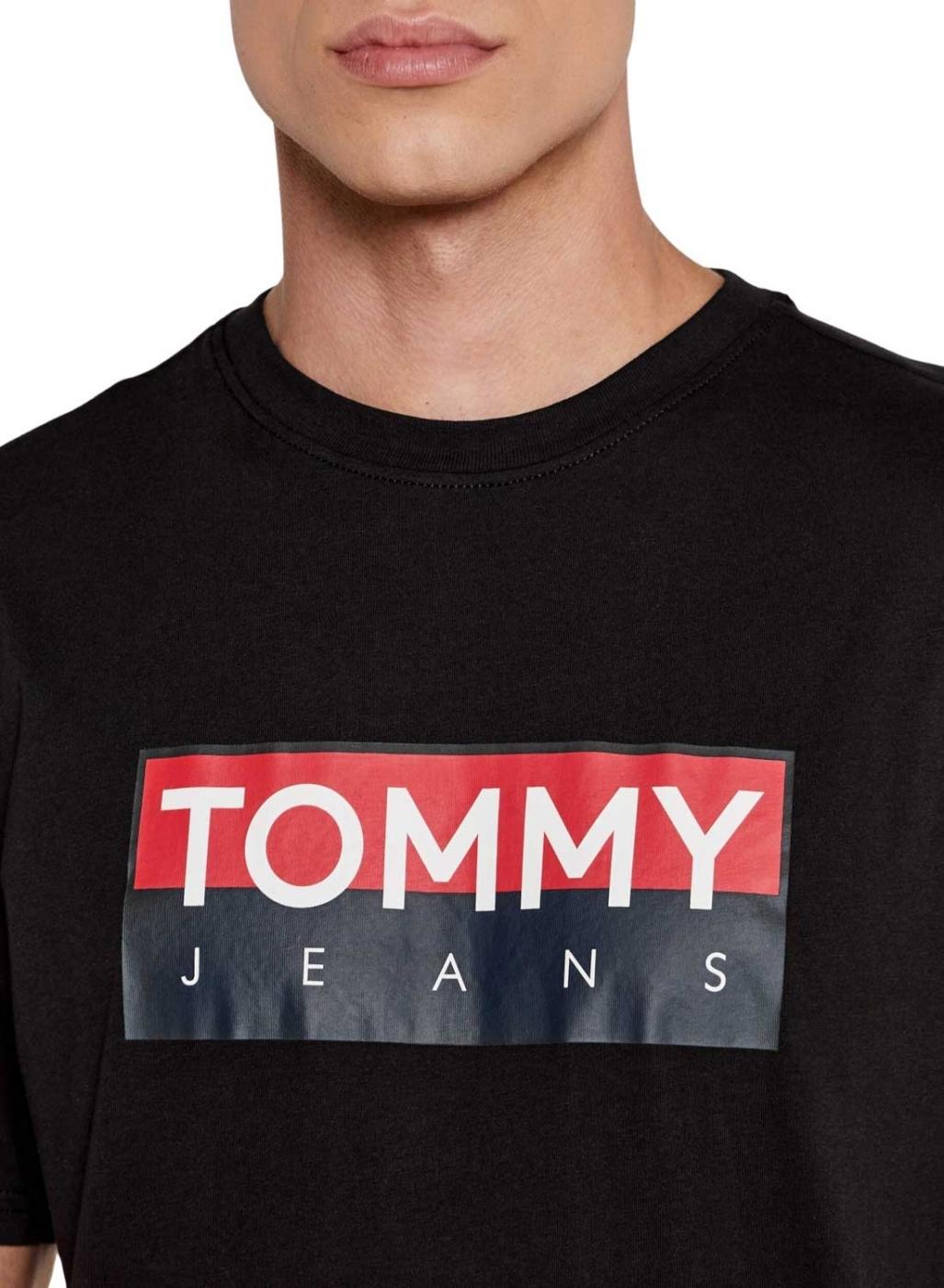 Camiseta Tommy Jeans. Modelo Entry. Cor preto. Gola redonda. Manga curta. Ajuste regular. Logo estampado no peito em vermelho e branco.