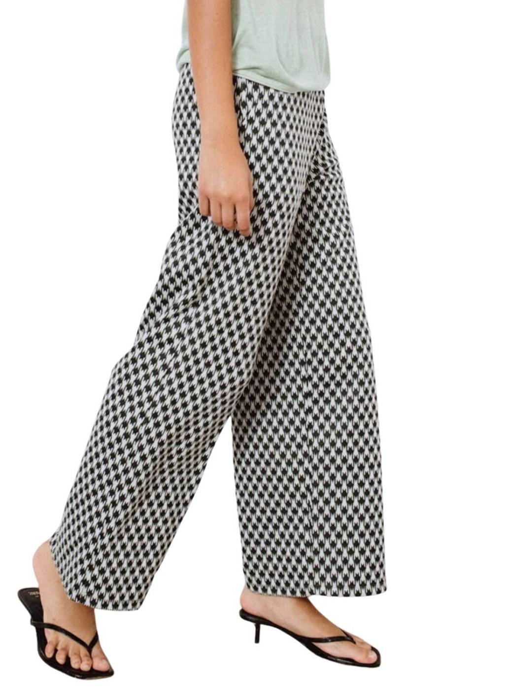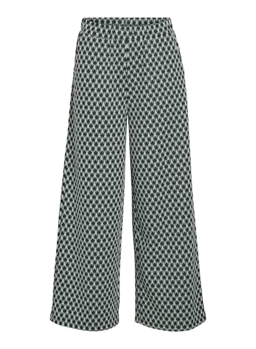 Calças Vila. Modelo Vijaquard. Cor verde. Comprimento até os tornozelos. Perna larga. Estampa geométrica estilo pé de galinha. Cintura elástica. Ajuste regular.