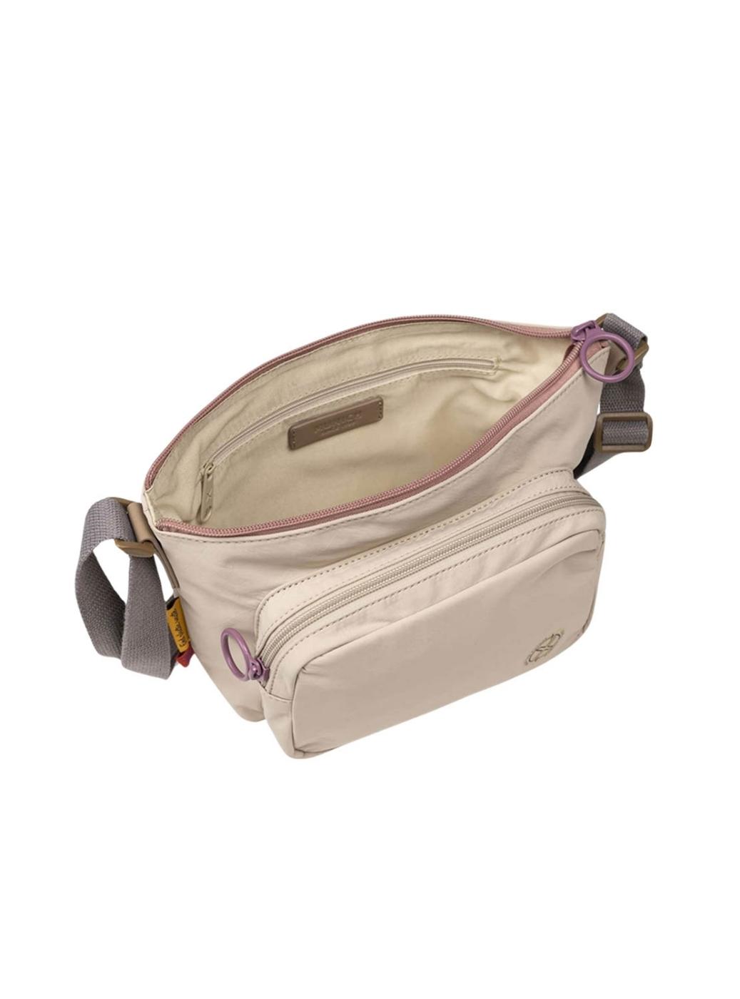 Bolsa de Munich. Modelo tiracolo. Cor bege. Tecido feito com garrafas de plástico recicladas. Bolso frontal com zíper e dois compartimentos laterais em tricô elástico. Interior com bolso com zíper. Muito leve, peso 300g. Medidas: 28cm x 8cm x 17,5cm.