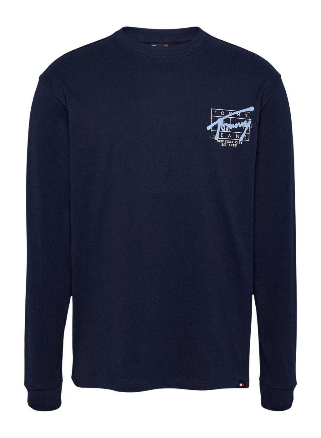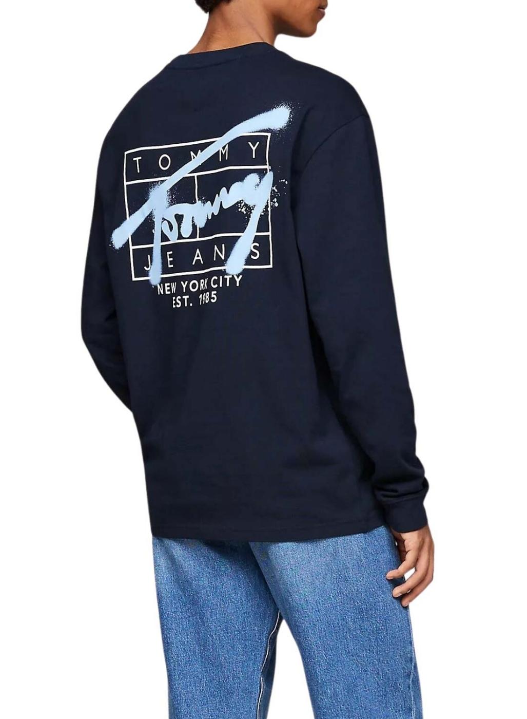 Camiseta Tommy Jeans. Modelo Spray. Cor azul marinho. Gola redonda. Manga comprida. Punhos elásticos. Ajuste regular. Logotipo maxi estampado na parte de trás com efeito de grafite. Mesmo logotipo em tamanho pequeno no peito.