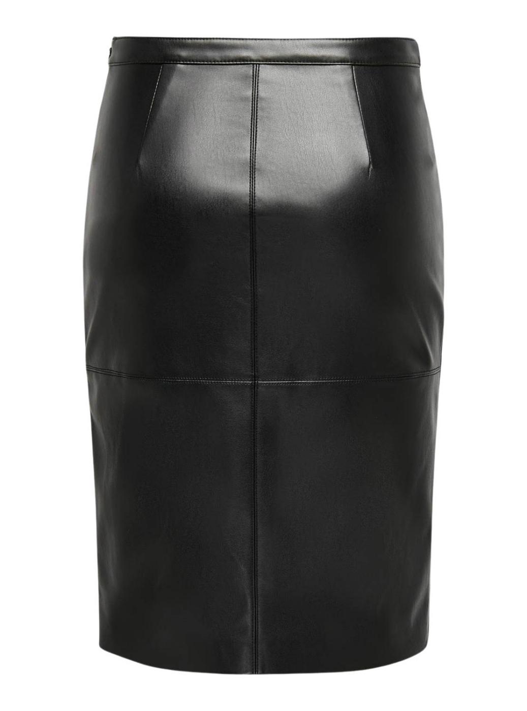 Saia Only. Modelo Newoline. Cor preta. Corte midi. Fecho com zíper invisível. Abertura lateral. Tecido de pele sintética. Costuras decorativas.