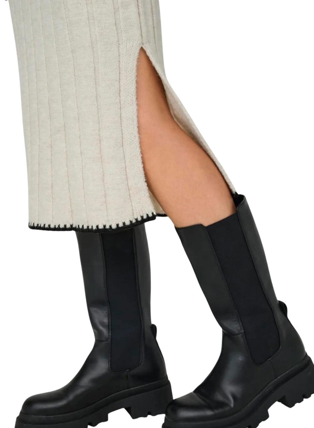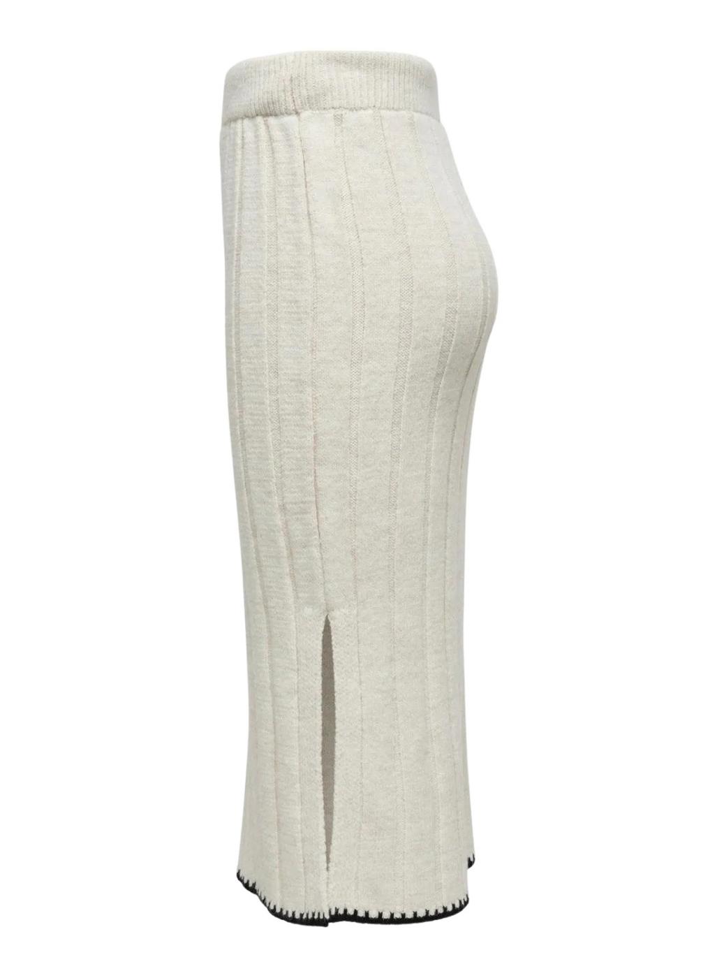 Saia Only. Modelo Chick. Cor bege. Tecido canelado. Cintura elástica. Corte midi. Abertura lateral. Costuras decorativas na barra com linha em contraste preto.