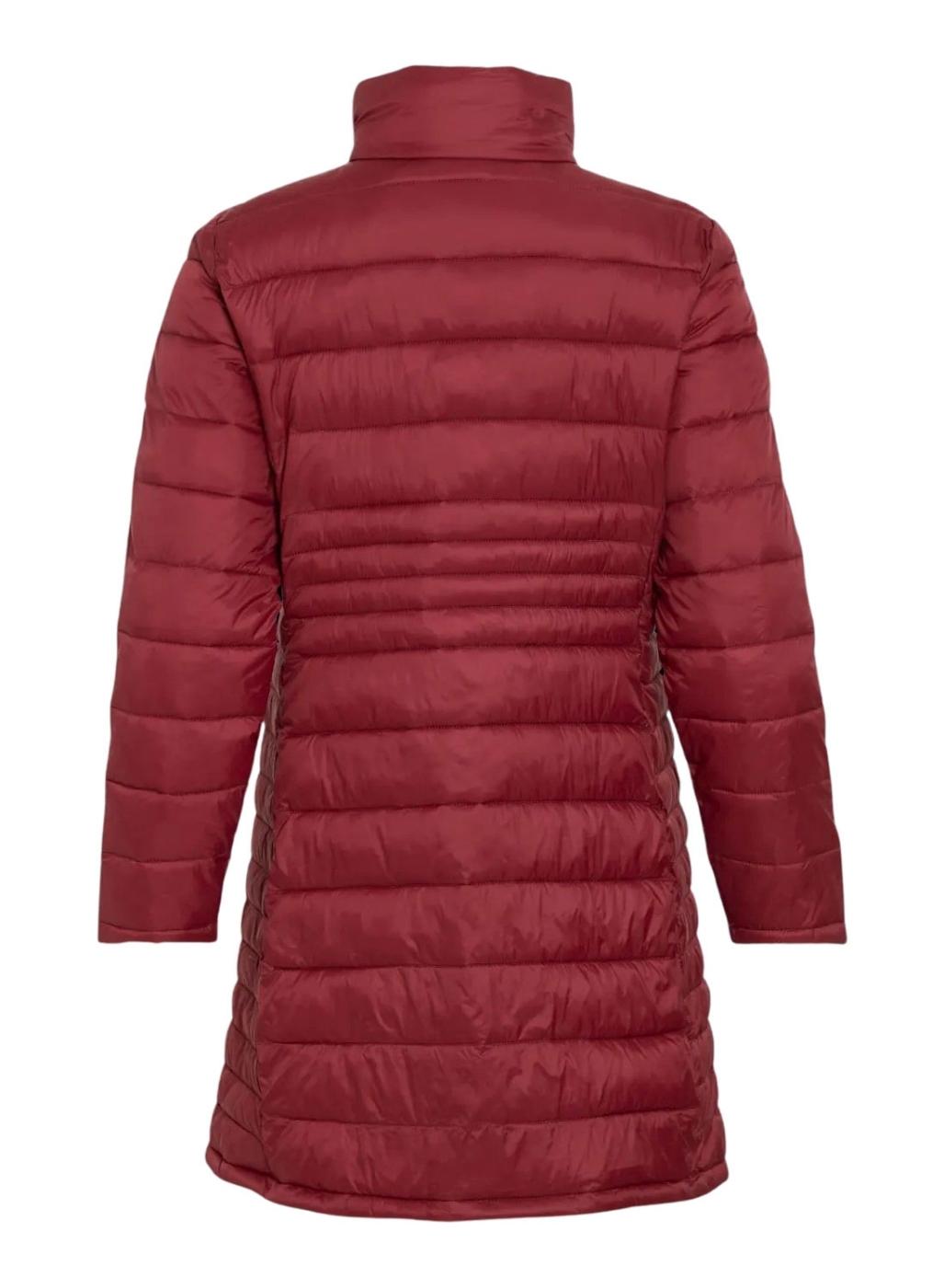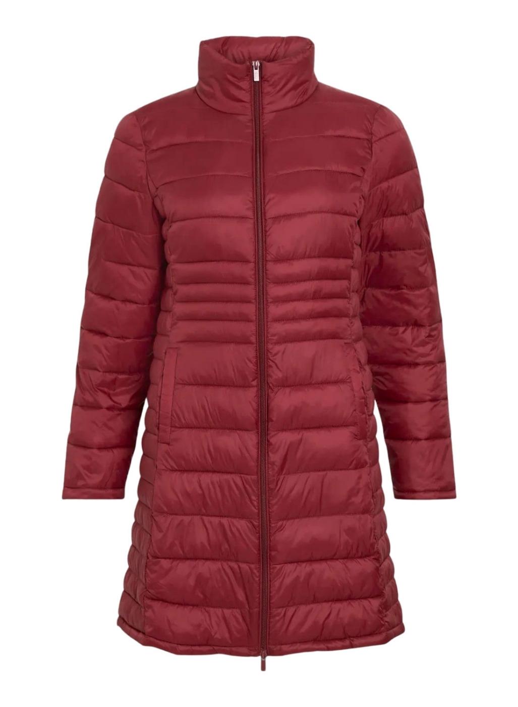 Casaco Vila. Modelo Visibiria. Cor granada. Tecido acolchoado. Enchimento de poliéster. Fecho com zíper. Gola alta. Bolsos laterais. Corte acima do joelho. Levemente ajustado na cintura.