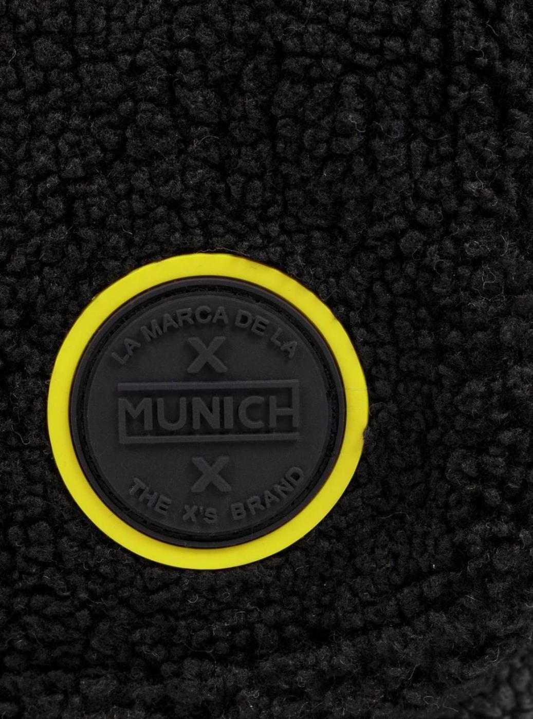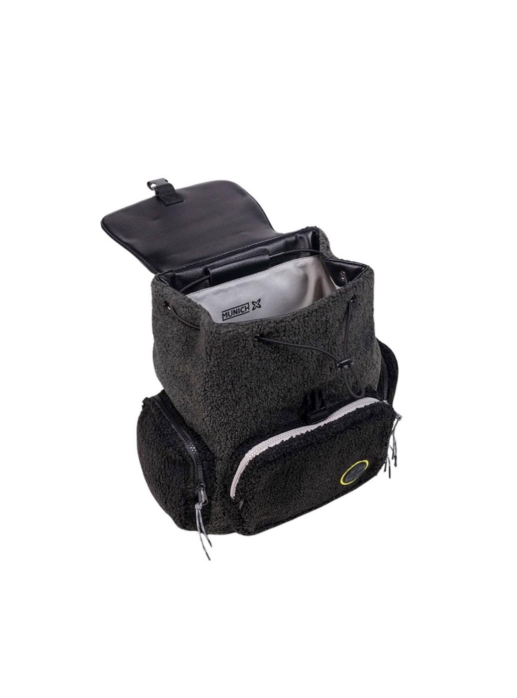 Mochila Munich. Modelo Deep. Cor preta. Tecido de pelúcia. Detalhes em neon. Compartimento principal com fecho por cordão e fivela. Bolsos frontais, laterais e compartimento interior com zíper. Parte traseira em mesh para maior respirabilidade. Puxadores elásticos com estilo outdoor. Interior com dois compartimentos. Dimensões: 34x27x14 cm. Capacidade: 13 litros.
