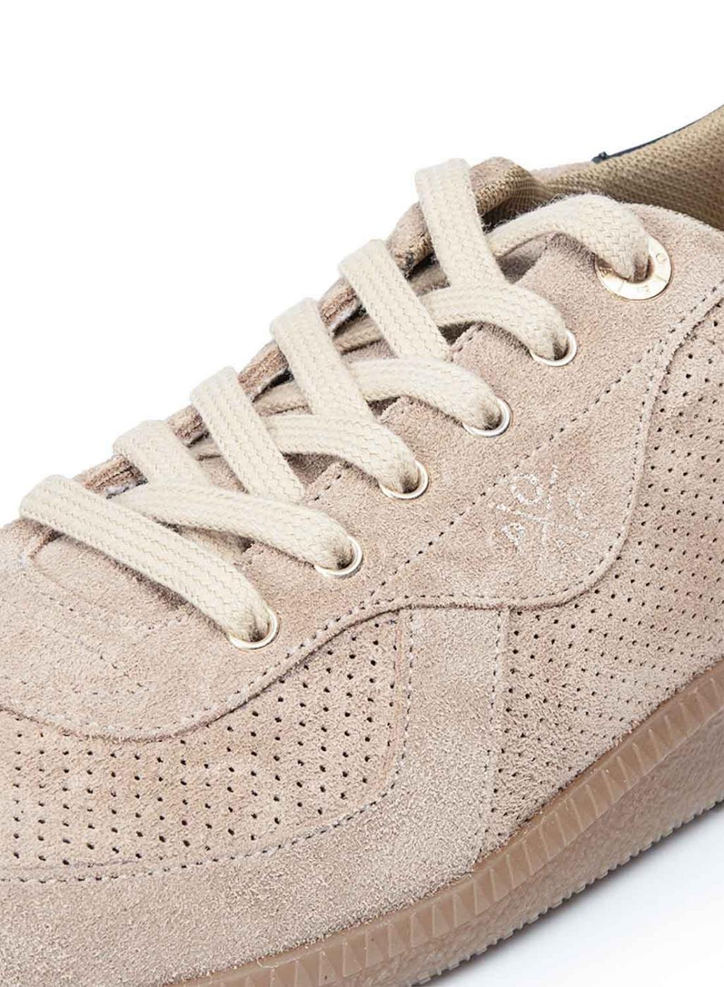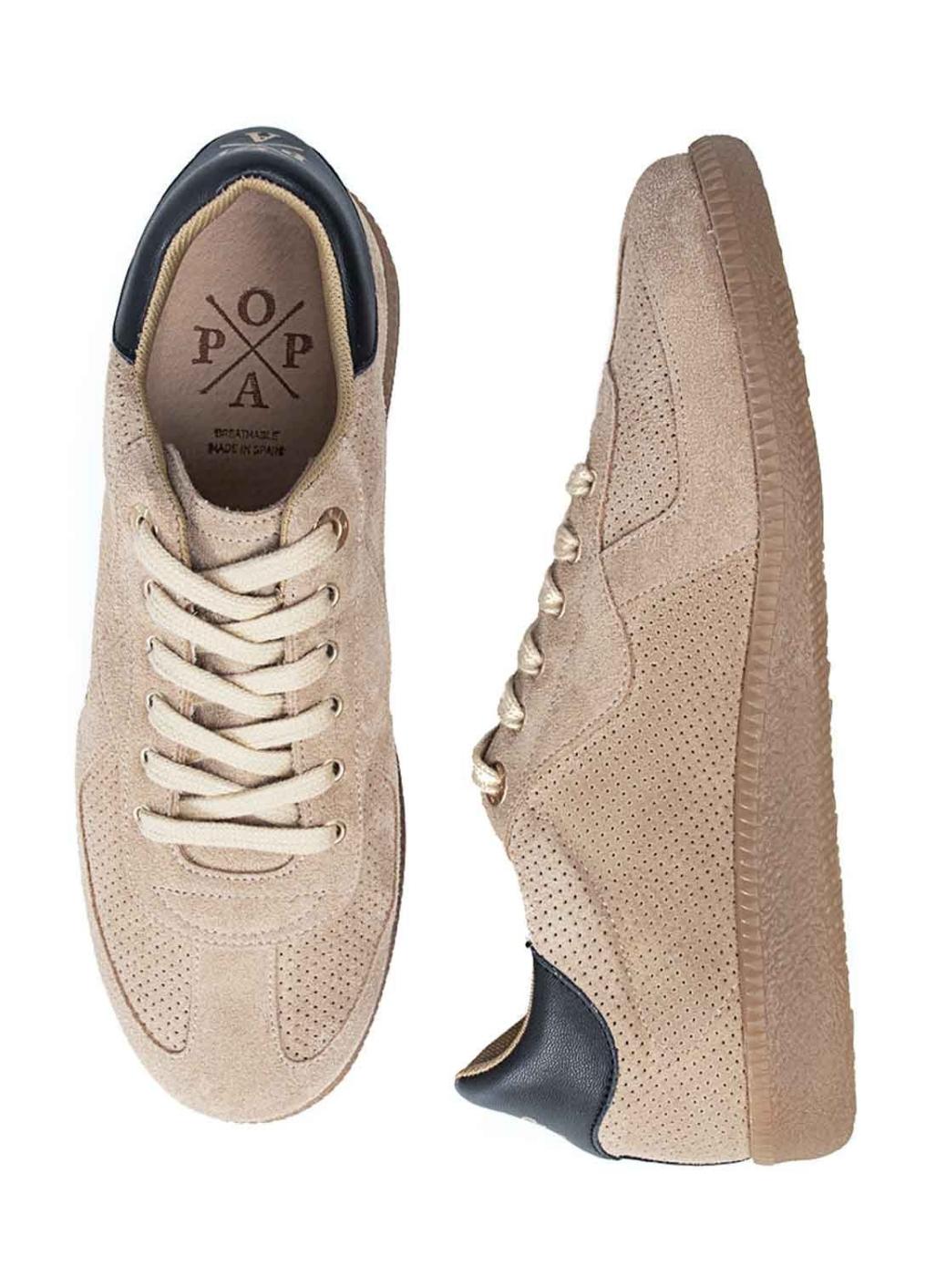 Sapatilhas Popa. Modelo Imperial. Cor bege. Fecho com cordões. Parte superior com painéis perfurados e painéis lisos. Sola de borracha em cor caramelo.