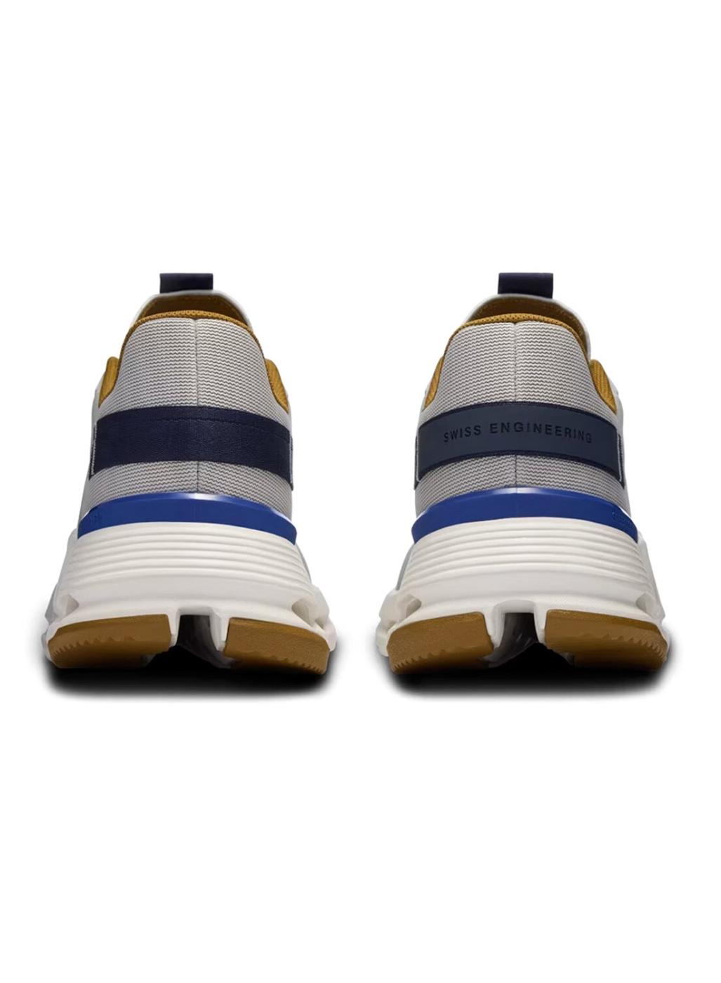 Sapatilhas On. Modelo Cloudnova Form 2. Cor cinza. Parte superior semitransparente e ultra macia. Detalhes de cor em azul e amarelo. Entressola de espuma Zero-Gravity. Tecnologia Speedboard com mistura de nylon. Maior suporte. Respirável. Entressola feita com 50% de materiais renováveis. Amarração padrão. Drop do calcanhar à ponta do pé de 14 mm.