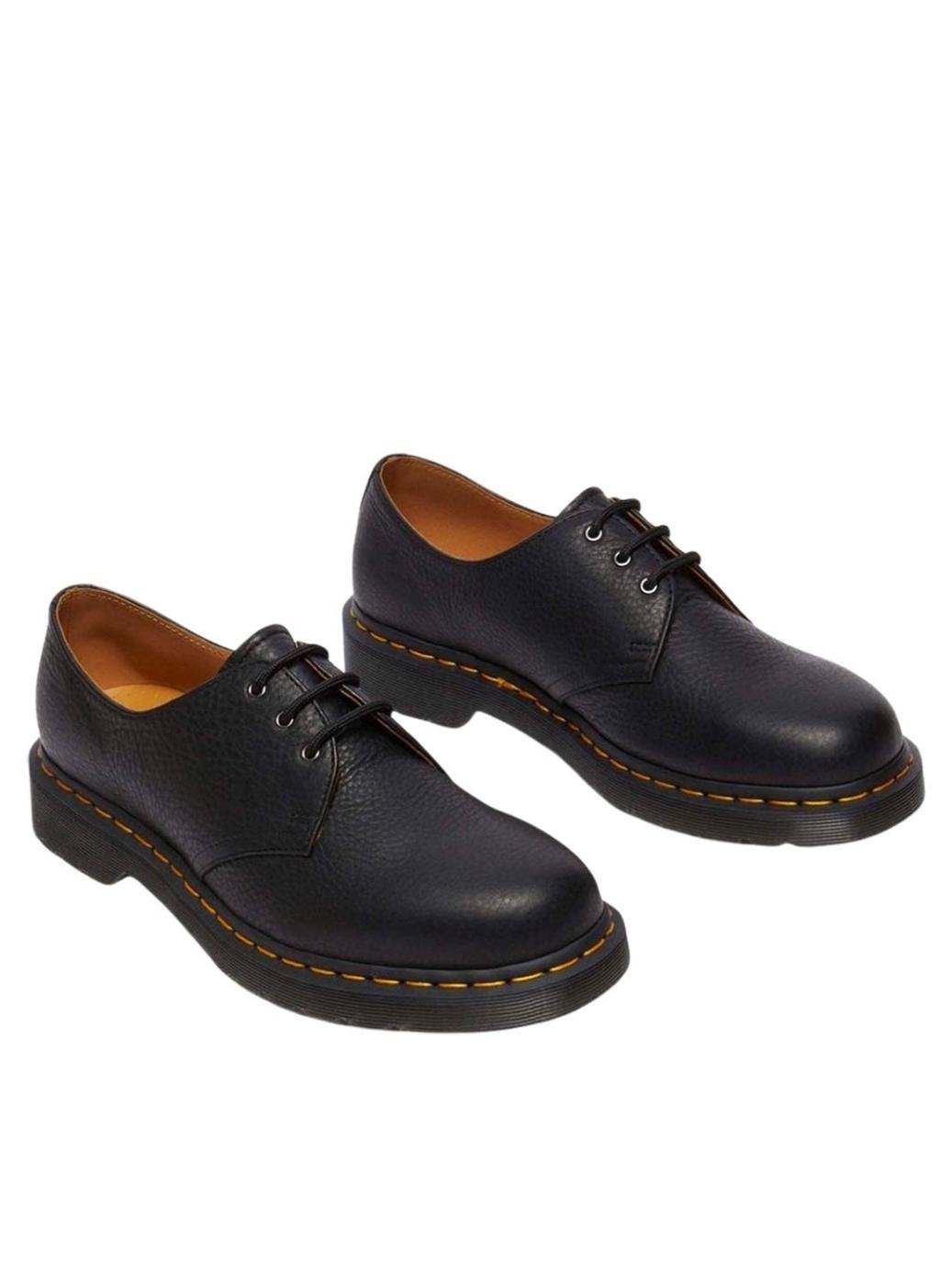 Sapato Dr Martens. Modelo 1461. Cor preto. Couro texturizado com acabamento engraxado e toque suave. A sola é reforçada com a icônica costura amarela. Puxador de calcanhar. Fecho com cadarço de três ilhós. Sola de PVC.