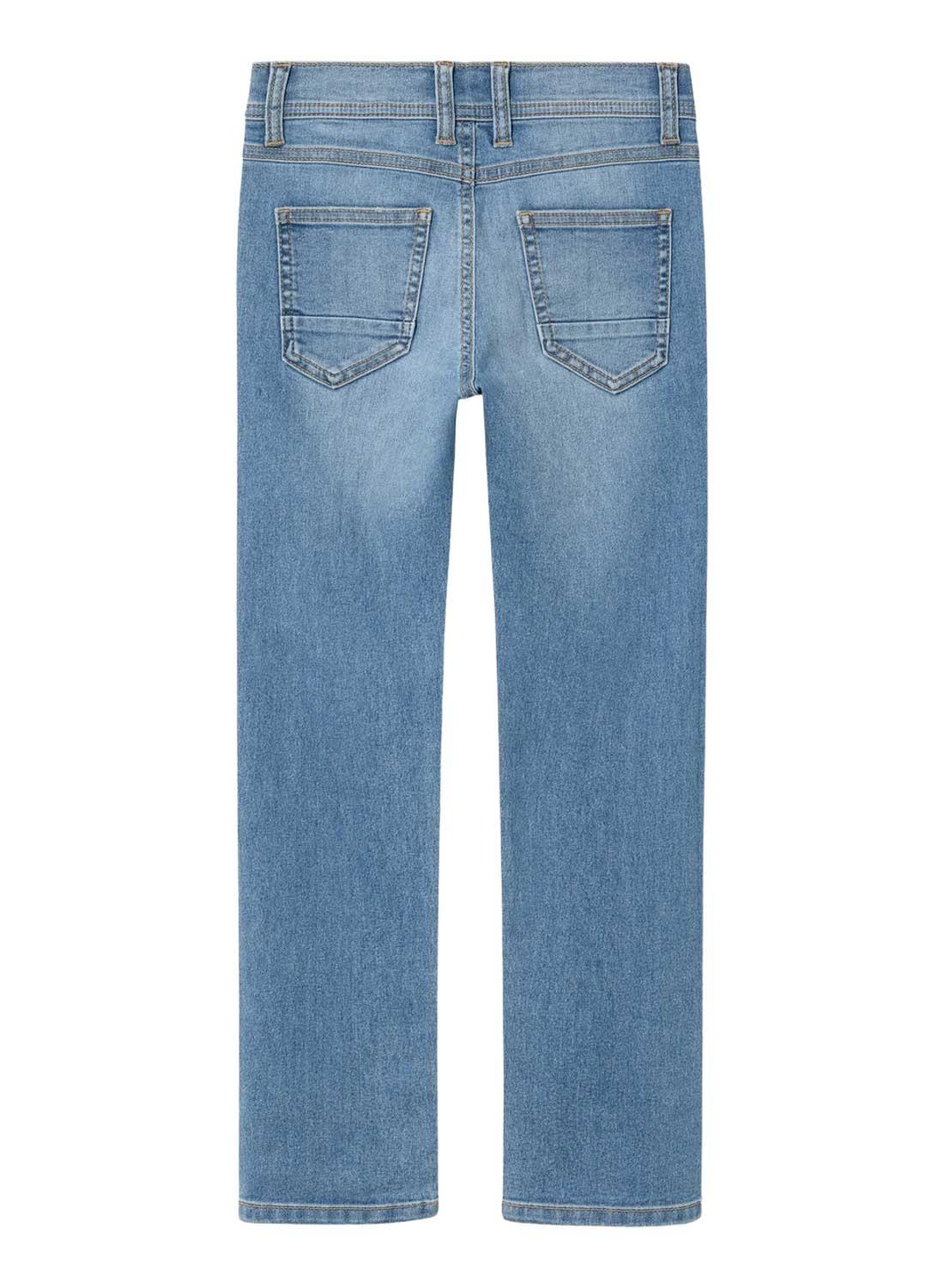 Calça jeans Name It. Modelo Silas. Denim com efeito lavado. Corte slim. Cinco bolsos. Fechamento com botão e zíper. Cintura ajustável com elástico interno.